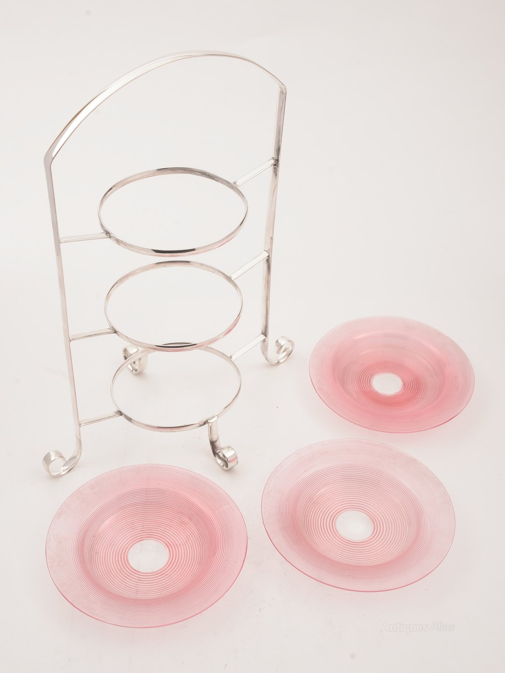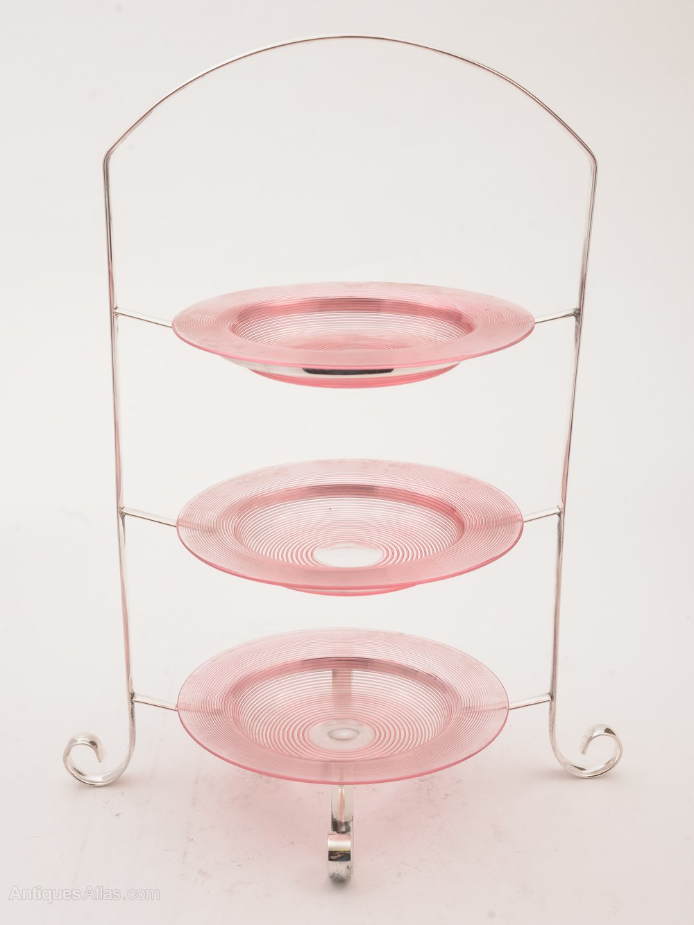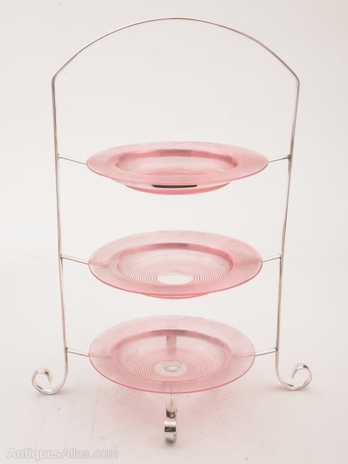 A lovely English silver plated 3 tier cake stand with 3 cranberry glass plates which have threaded decoration. Stands on 4 curled feet with central carrying handle. Circa 1910.
