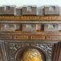 Packed with detail: contrasting woods, heraldic shield, masks, gilt lettering.