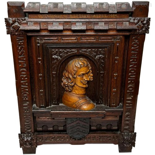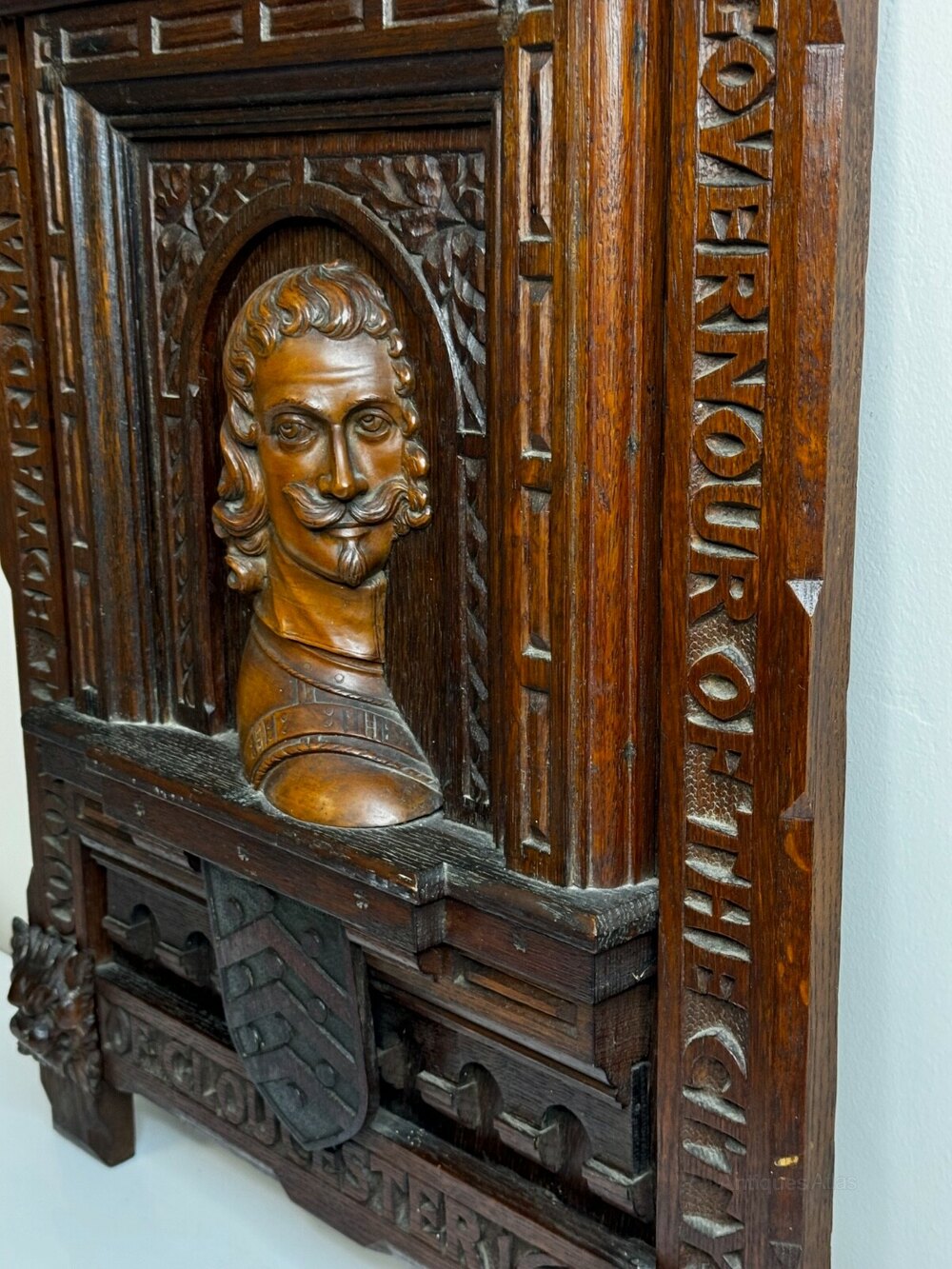 Carved in the 19th century in a Gothic Revival style from earlier oak boards (very likely 18th century or earlier), it combines genuine age with a named historical figure, giving the piece strong period character and presence.