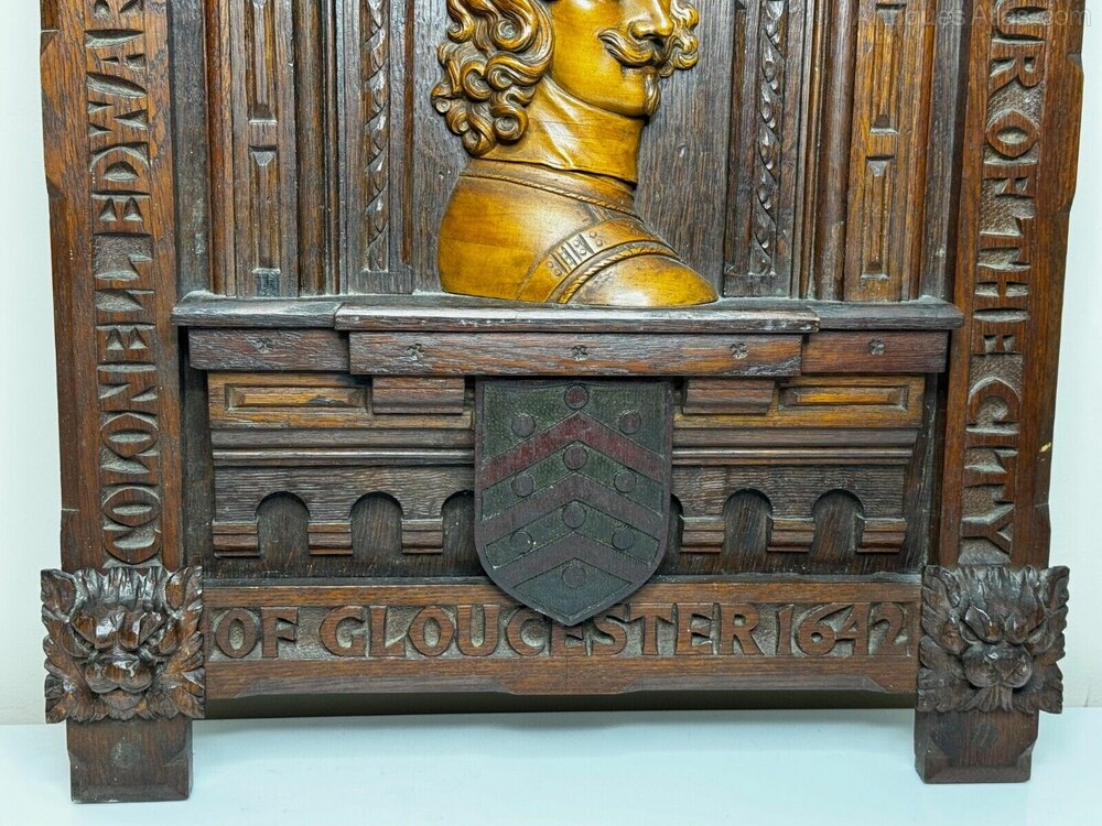 This plaque commemorates his role and will appeal to collectors of English Civil War history, military portraiture and heraldic carving.