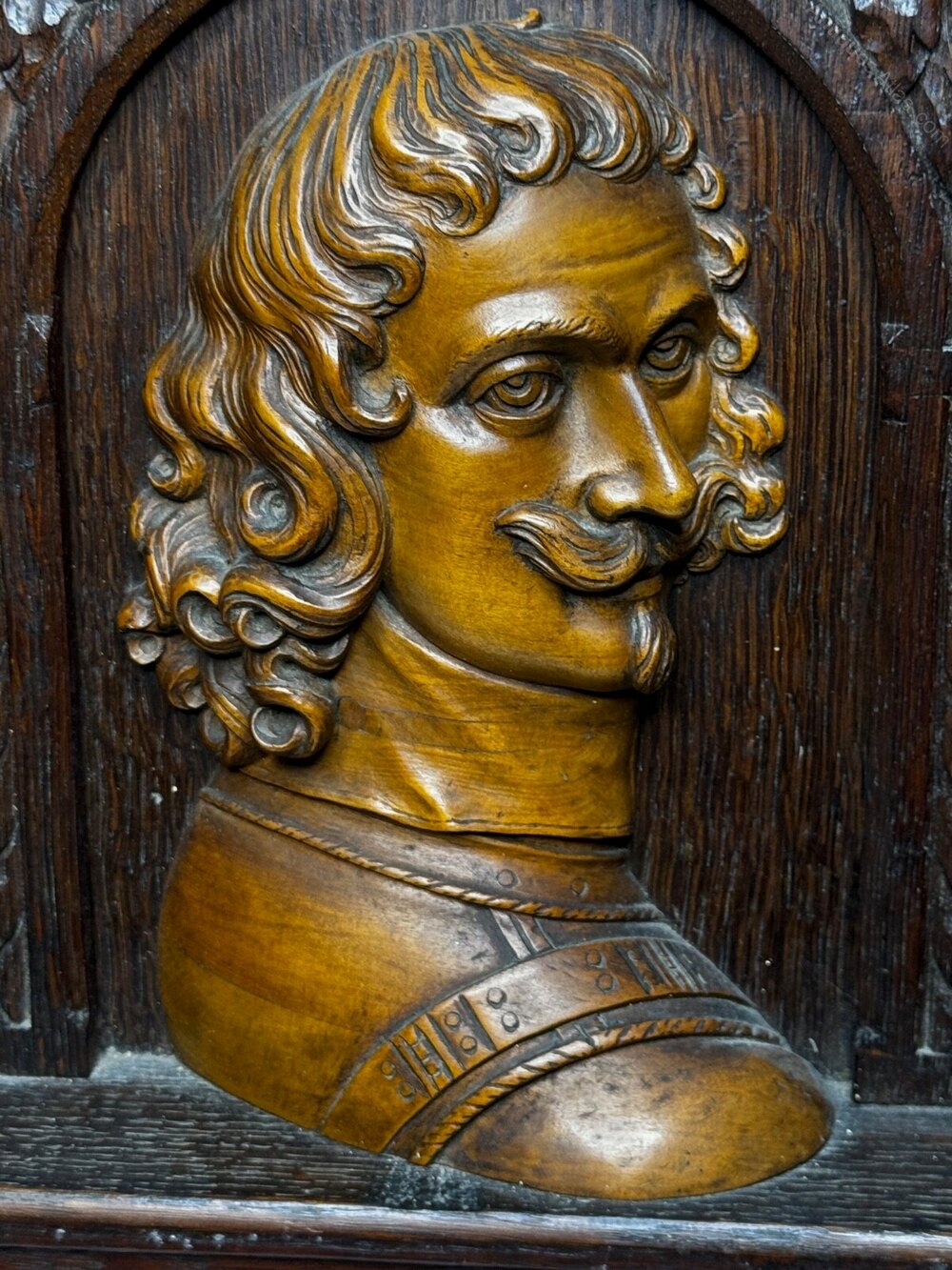 A handsome carved oak and fruitwood wall plaque depicting Colonel Sir Edward Massey, Governor of Gloucester (1642) and later Governor of Sudeley Castle (1644) during the English Civil War.