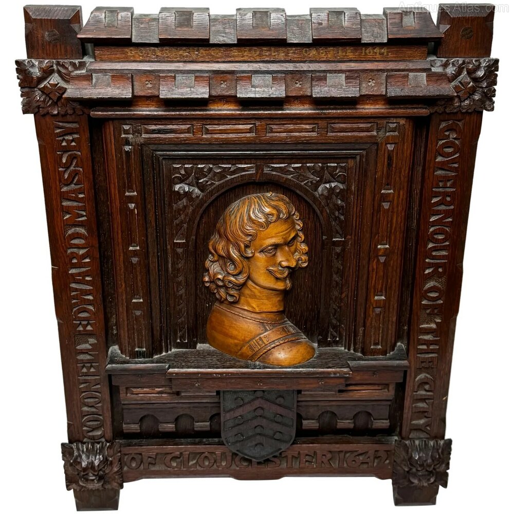 Antique English Civil War Gothic Revival Portrait Plaque – Colonel Sir Edward Massey in Oak & Fruitwood