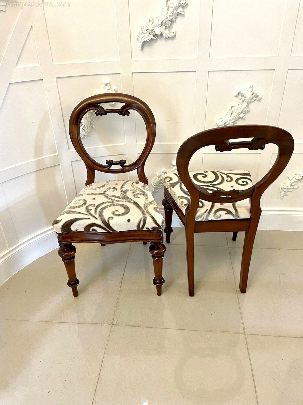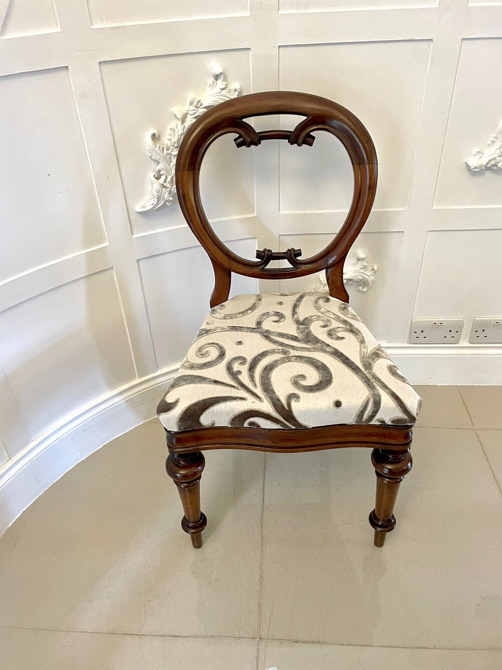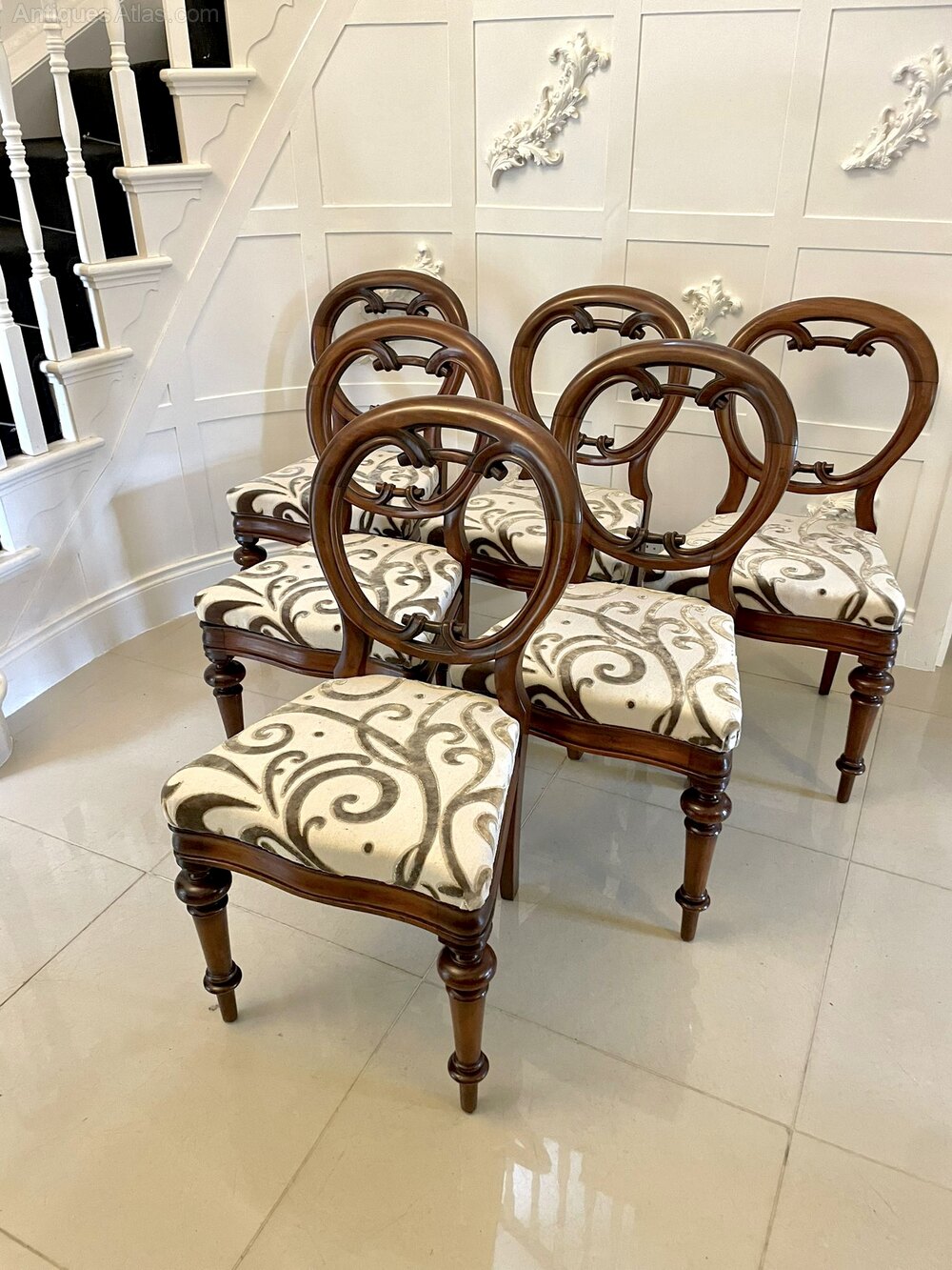 outstanding set of six 19th Century Victorian antique mahogany balloon back dining chairs having circular backs and a beautifully carved lower rail standing on elegant turned fluted legs to the front and out swept back legs. The drop in seats have been newly reupholstered in a quality stylish fabric.