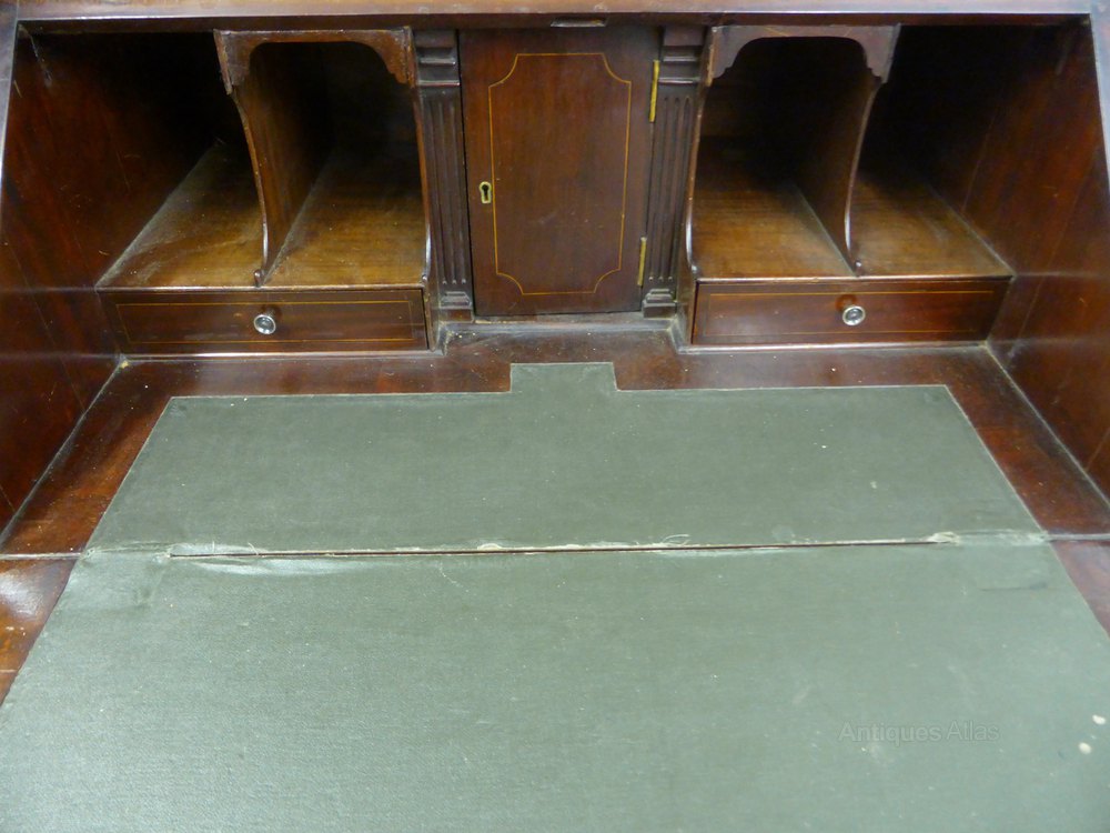 For sale is an Edwardian Mahogany Bureau Bookcase of small proportions. The bookcase top has a nicely carved and dentil molded cornice with two glazed doors below. When opened the doors reveal three adjustable shelves. Below this is the bureau sections, the fall at the top of the bureau opens to reveal a fitted interior which includes two drawers, a centre cupboard and four pigeon holes. When the centre cupboard is opened there are two secret compartments accessible by small pulls at the top. Below the fall are four graduated drawers, the bureau bookcase stands on bracket feet and is in good condition. It comes complete with three keys. Please note the fall can be re-leathered, or baised to a colour of your choice.