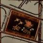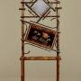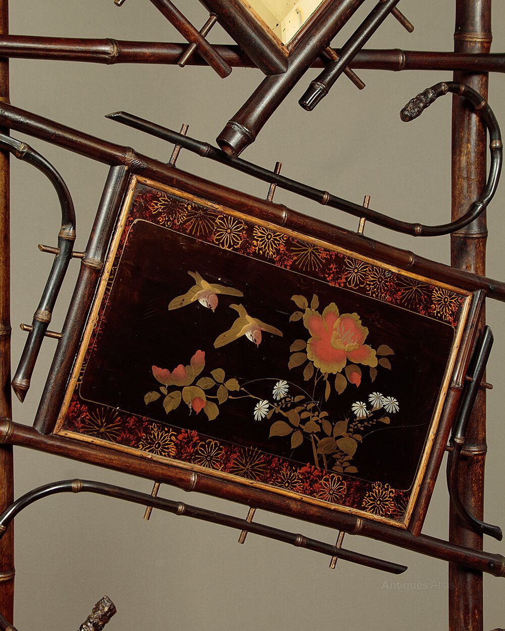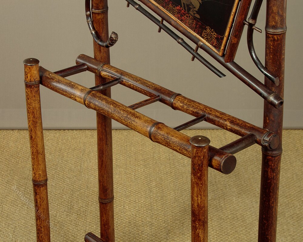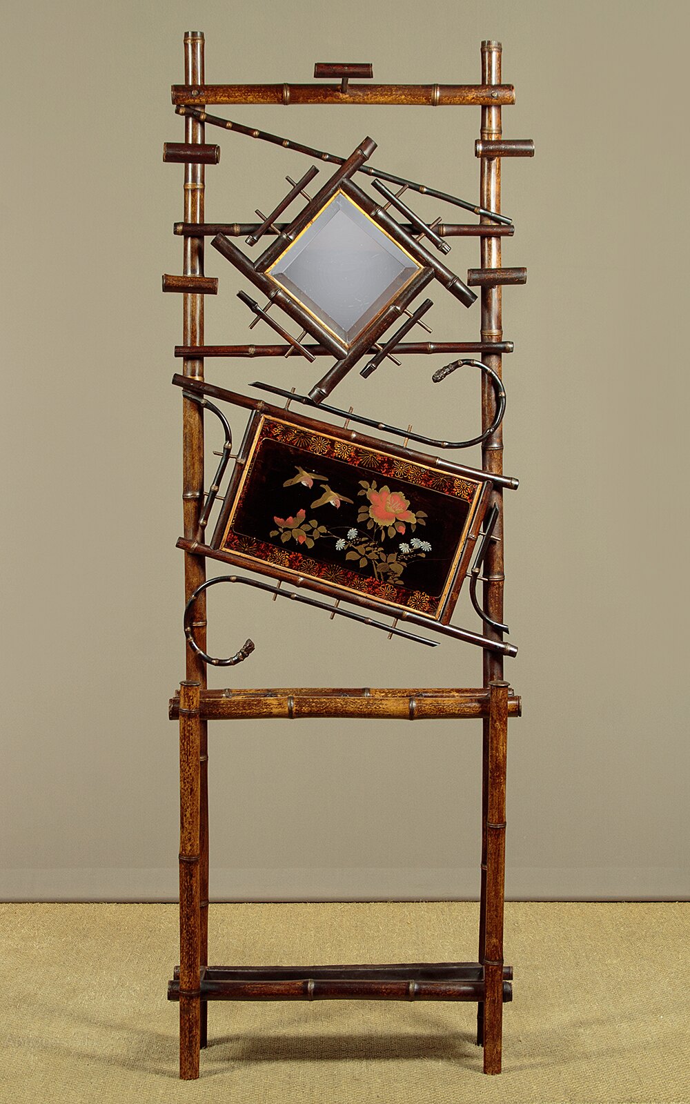 Neat little late 19th.c. Aesthetic Movement bamboo hat stand c.1890. Just 27″ wide. Five bamboo mallet shaped hooks for hats arranged around a diamond shaped mirror with a bevelled edge. Over a superb lacquered or 'Japanned' panel featuring an image of birds. With a stand for sticks and umbrellas below with a loose metal drip tray in the base. Some tarnish to the mirror, generally very good condition. Cleaned and waxed in our workshops.