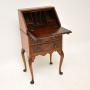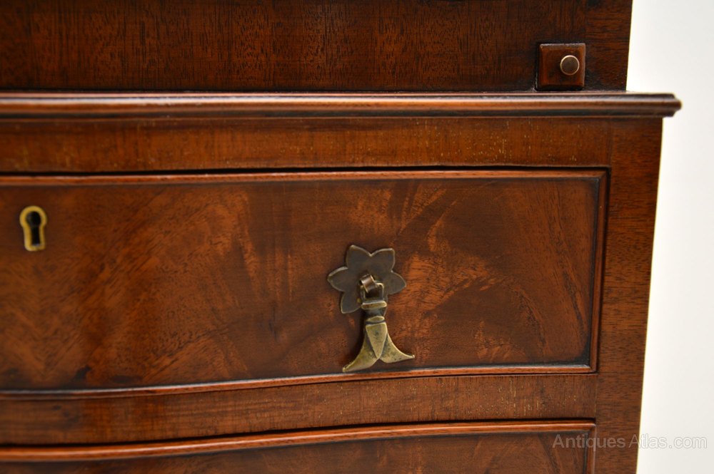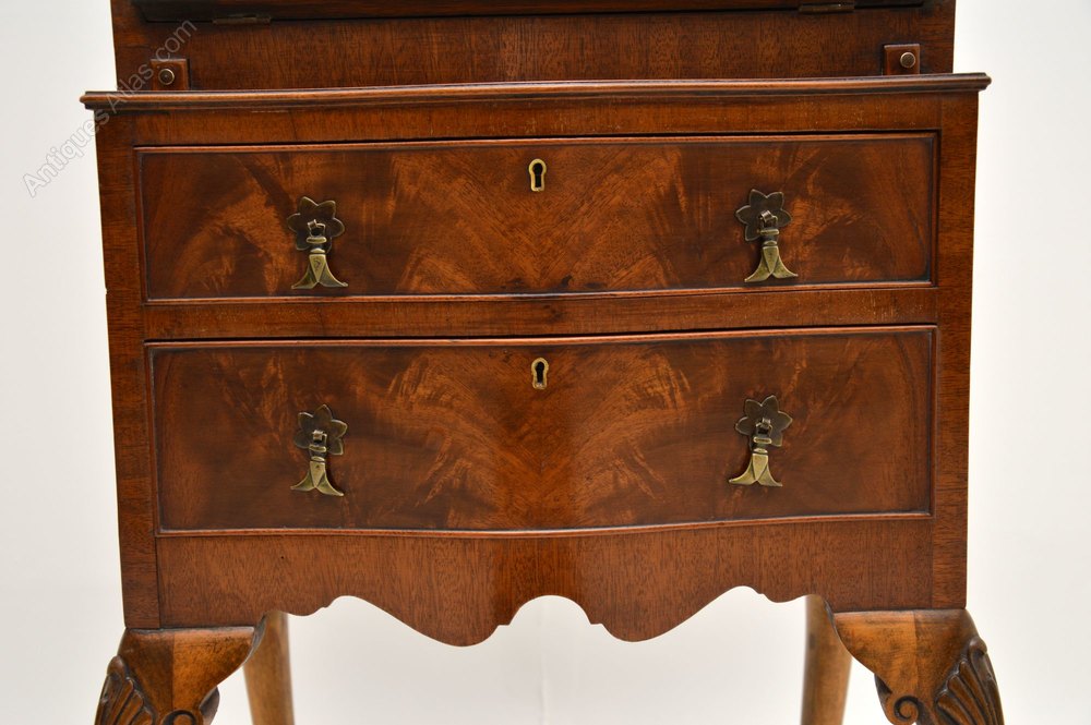 This is of extremely fine quality, it is a lovely slim and useful size. The flame mahogany veneers are striking and have a beautiful colour. The construction is all solid wood with solid oak lined drawers and fine dovetailed joints. This has the original brass pendant handles and a useful work space with pigeon holes and extra interior drawers.