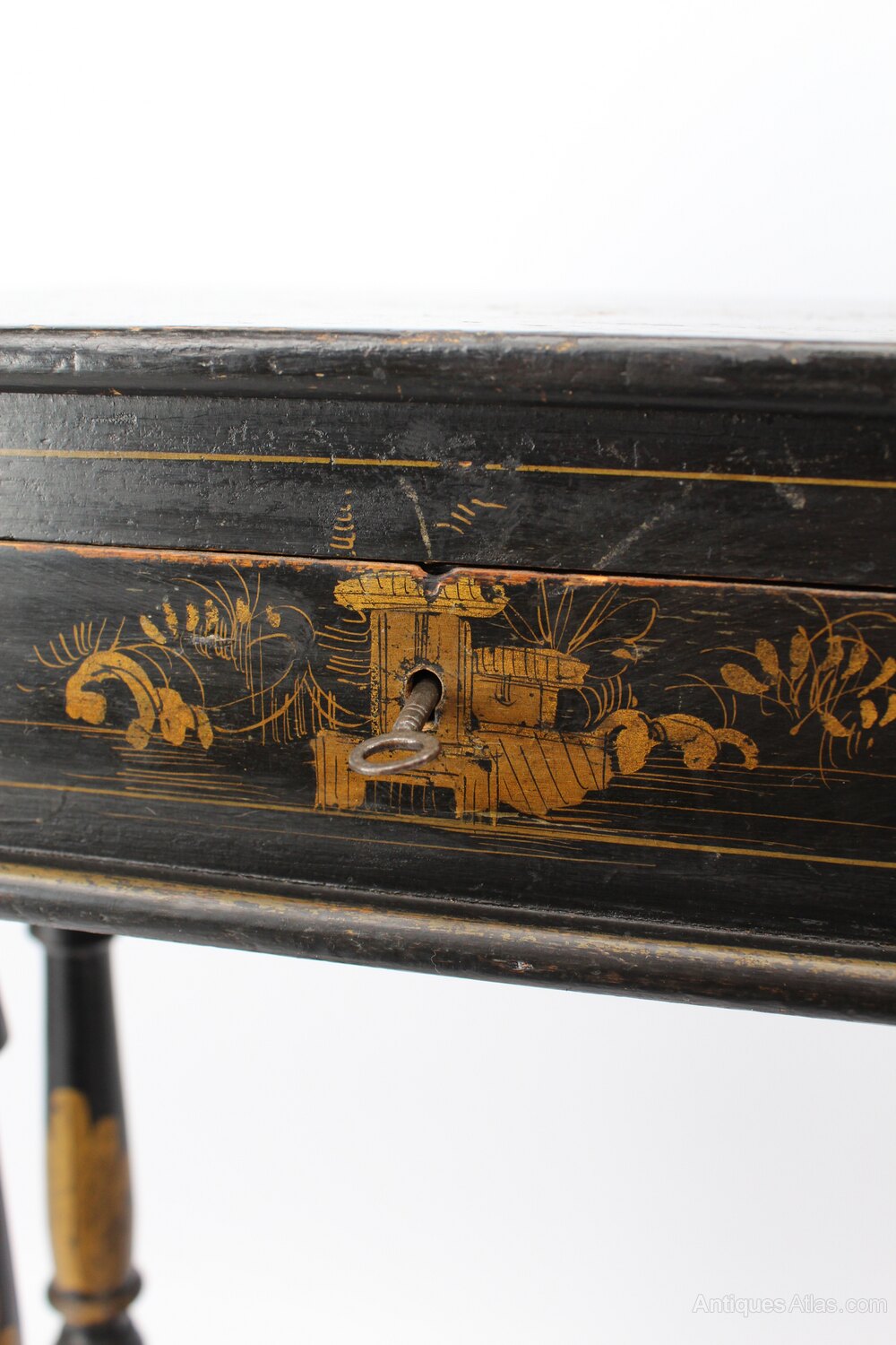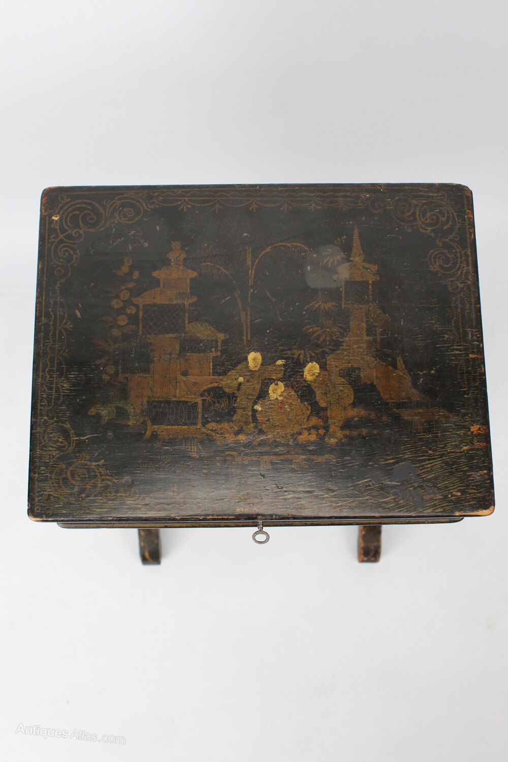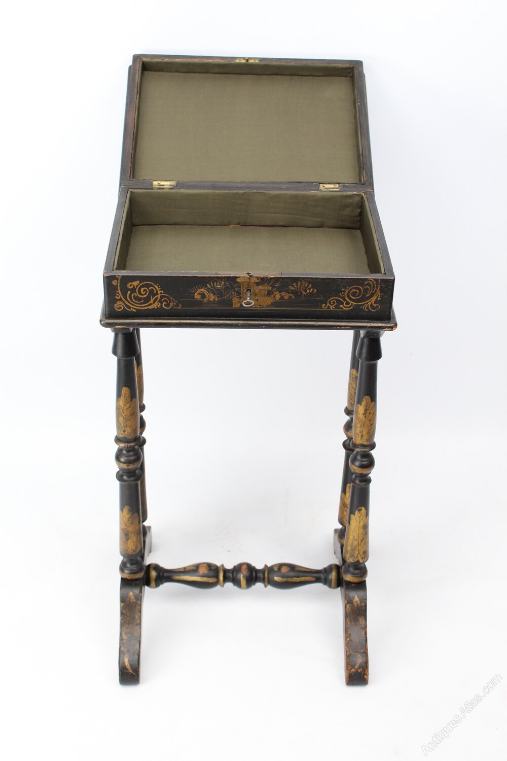 A stylish small antique 19th century French ebonised Chinoiserie work table or lamp table dating from circa 1870. Featuring a hand-painted top which lifts up to reveal a lined interior for storage. The front is decorated with a castle and locks and comes with a key. The base is supported by decoratively turned legs and arched feet joined by a turned cross stretcher, all decorated with gilt acanthus leaves. This sweet table is ideal for a small space and would look fantastic used to display a lamp.