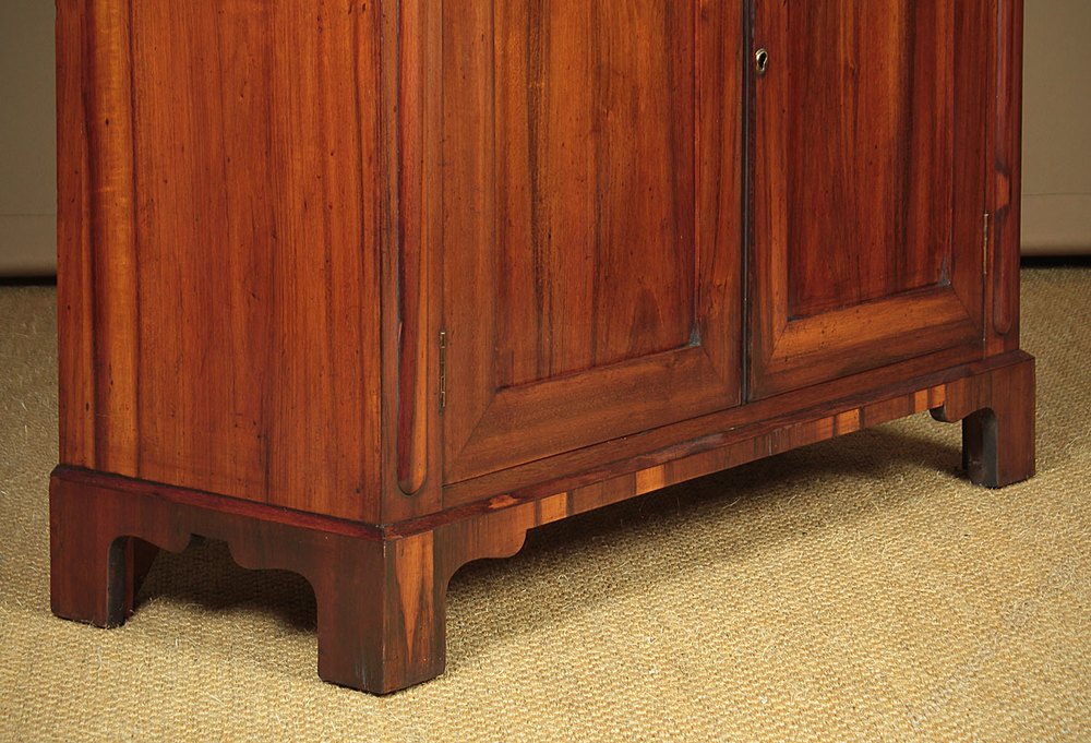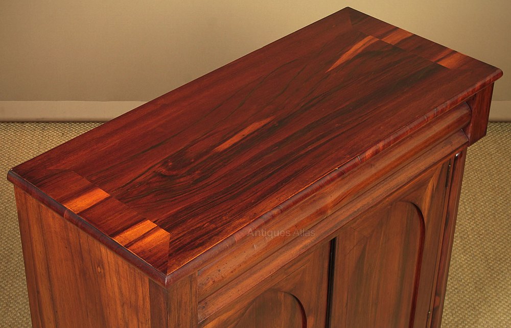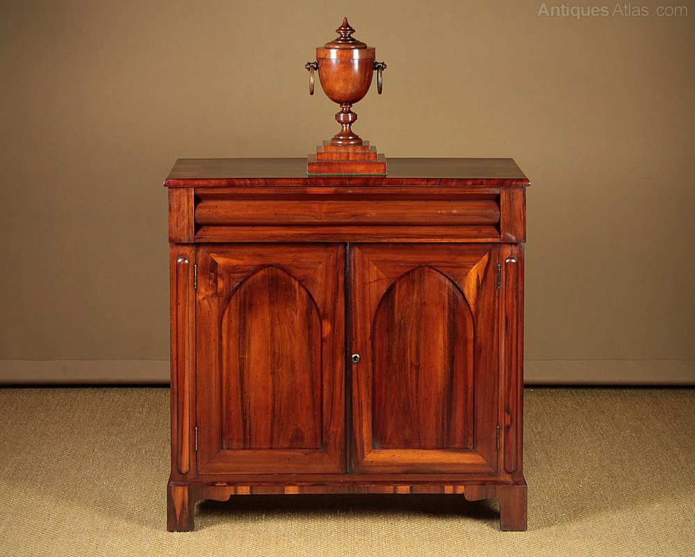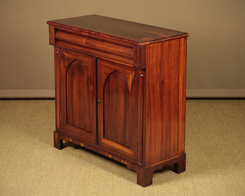 Unusual little mid 19th.c. chiffonier side cabinet in goncarlo alvez, a South American exotic hardwood with a similar appearance to rosewood c.1850. Just 36″ wide with a long drawer over a two door cupboard fitted with a single shelf. Highly figured goncarlo alvez veneers across the top front and sides. Crossbanded edge moulding, shaped drawer front and pointed gothic arch panelled doors flanked with a raised moulding to the uprights. Shaped bracket feet front and rear, also veneered to match. Excellent condition, cleaned and polished in our workshops. Key supplied.