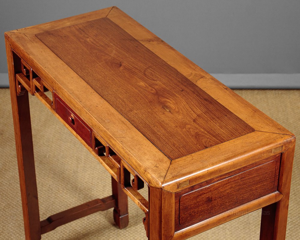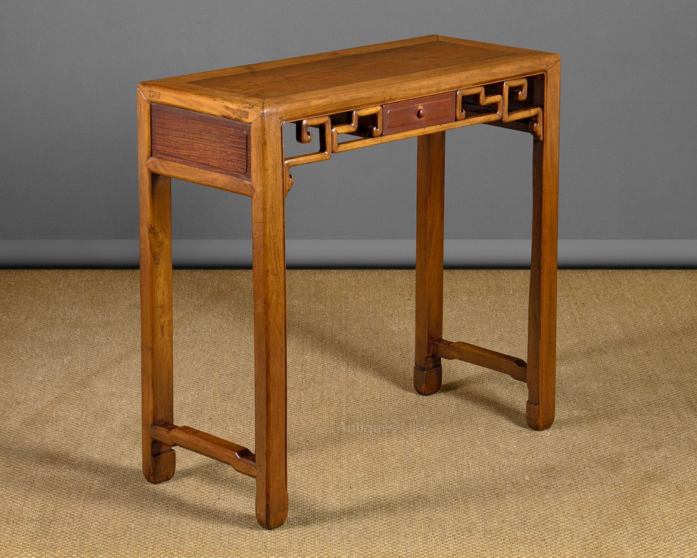 Elegant little early 20th.c. Chinese side table c.1920. Just 36" wide. Traditional construction in a fine grained hardwood. Flat panel top with cleated sides over a single small drawer flanked with a pierced apron. Straight legs with a simple shaped foot and joined with shaped side stretchers. Moulded panels at the sides. Note the apron is repeated at the rear of the table with a small polished panel in place of the drawer front. Excellent colour and condition, cleaned and waxed in our workshops.