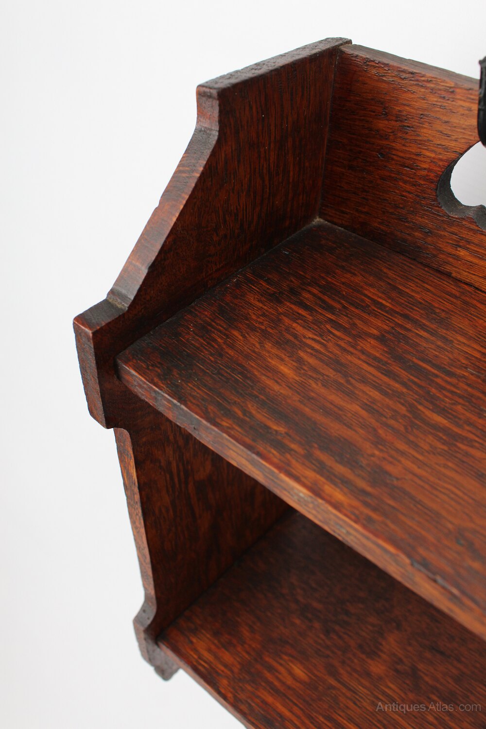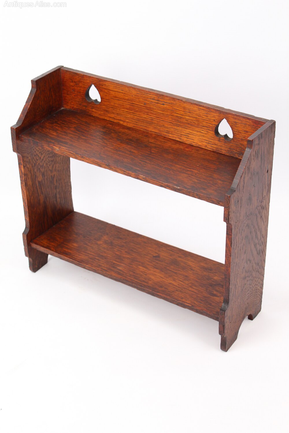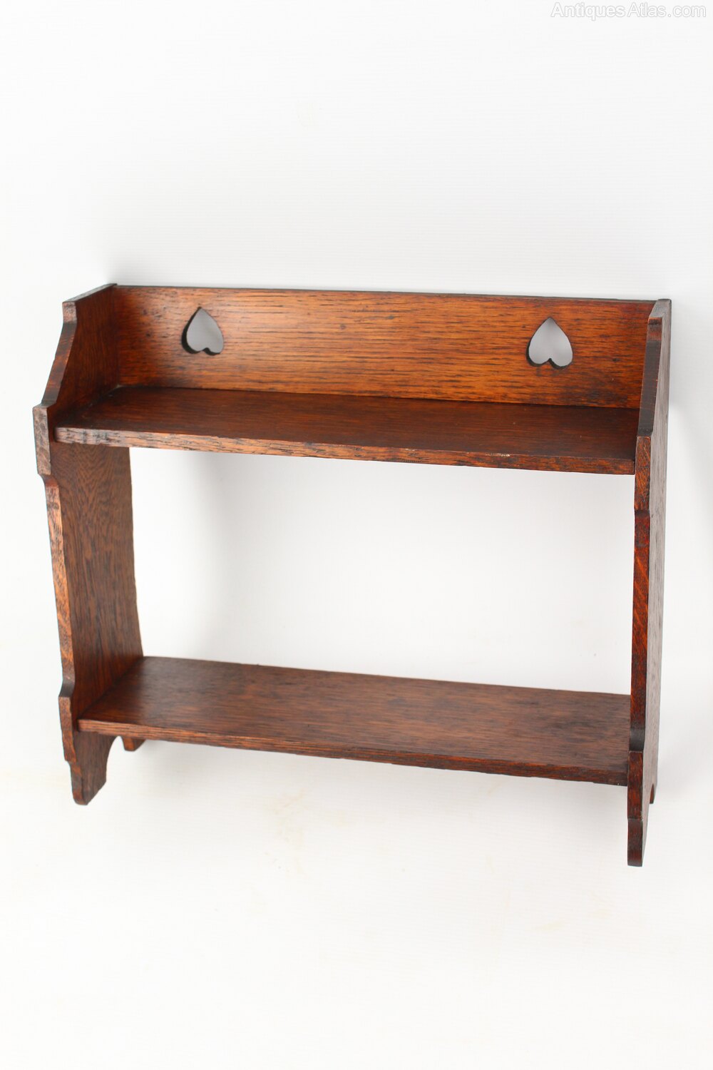 A stylish small antique Edwardian Arts and Crafts oak wall shelf dating from circa 1905. In lovely aged oak with good warm patina, it has two shelves, stepped sides and the back rail is decorated with pierced heart motifs. Equally suited for books or displaying objects. Possibly retailed by Liberty and co, certainly in the manner of. Supplied with brass wall fixings.