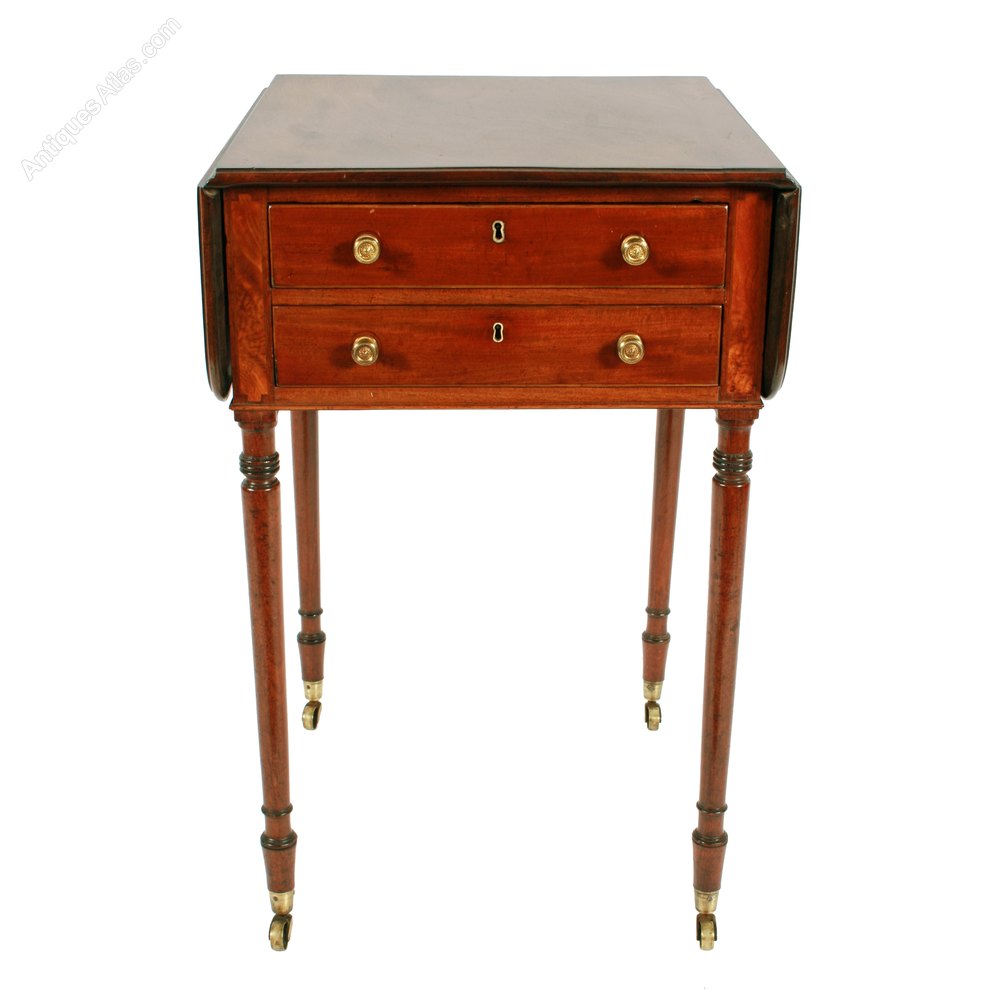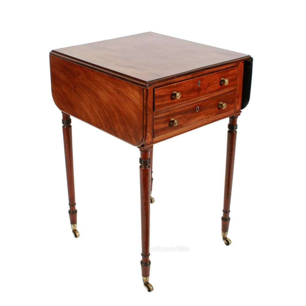 The drop leaves have a single flap underneath each to support each leaf and the table stands on turned legs with gilt brass casters.