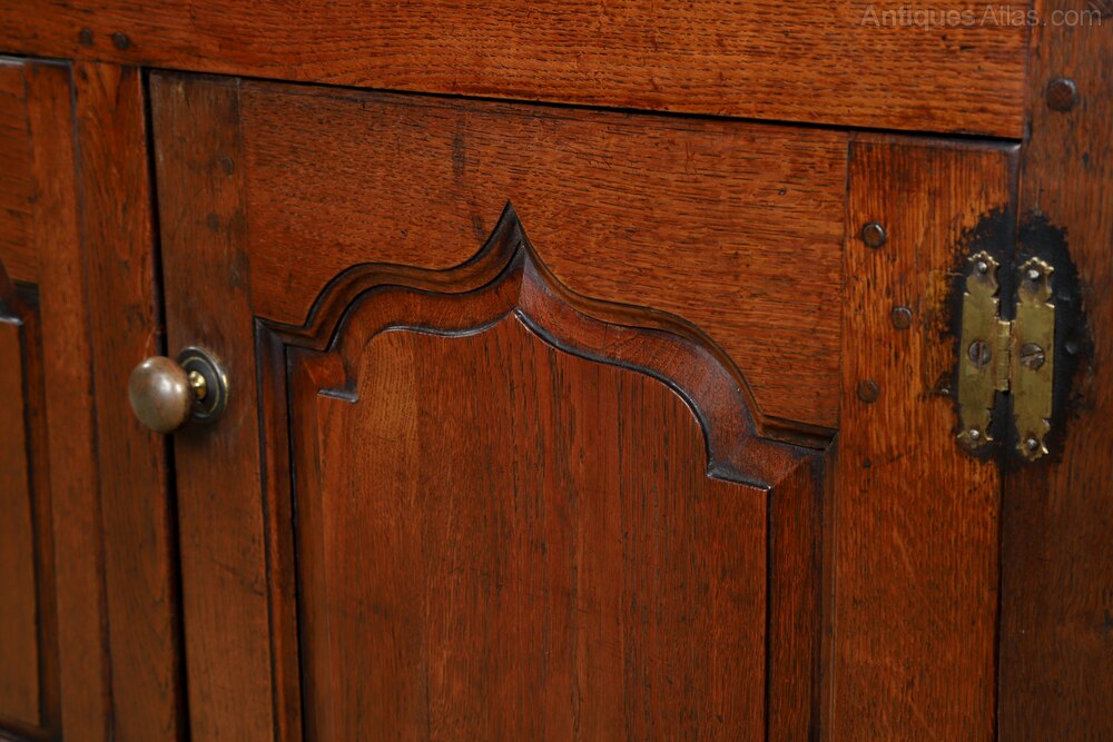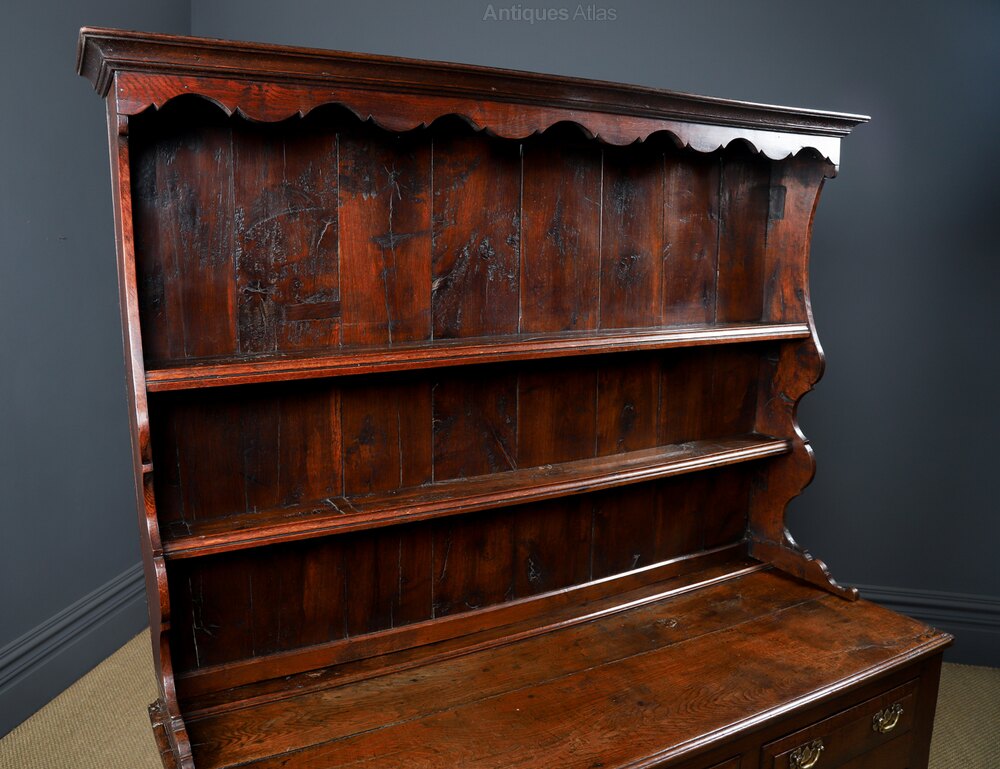 The oak rack is designed with a straight protruding cornice, featuring an elegant shaped apron below. The oak rack is constructed with serpentine shaped vertical ends, incorporating wide oak boards (the wider the boards, generally the better the quality) and two grooved horizontal shelves, which were designed to display plates and crockery. The oak rack rests upon two shaped “shoes” which are secured to the dresser base with two screws.
