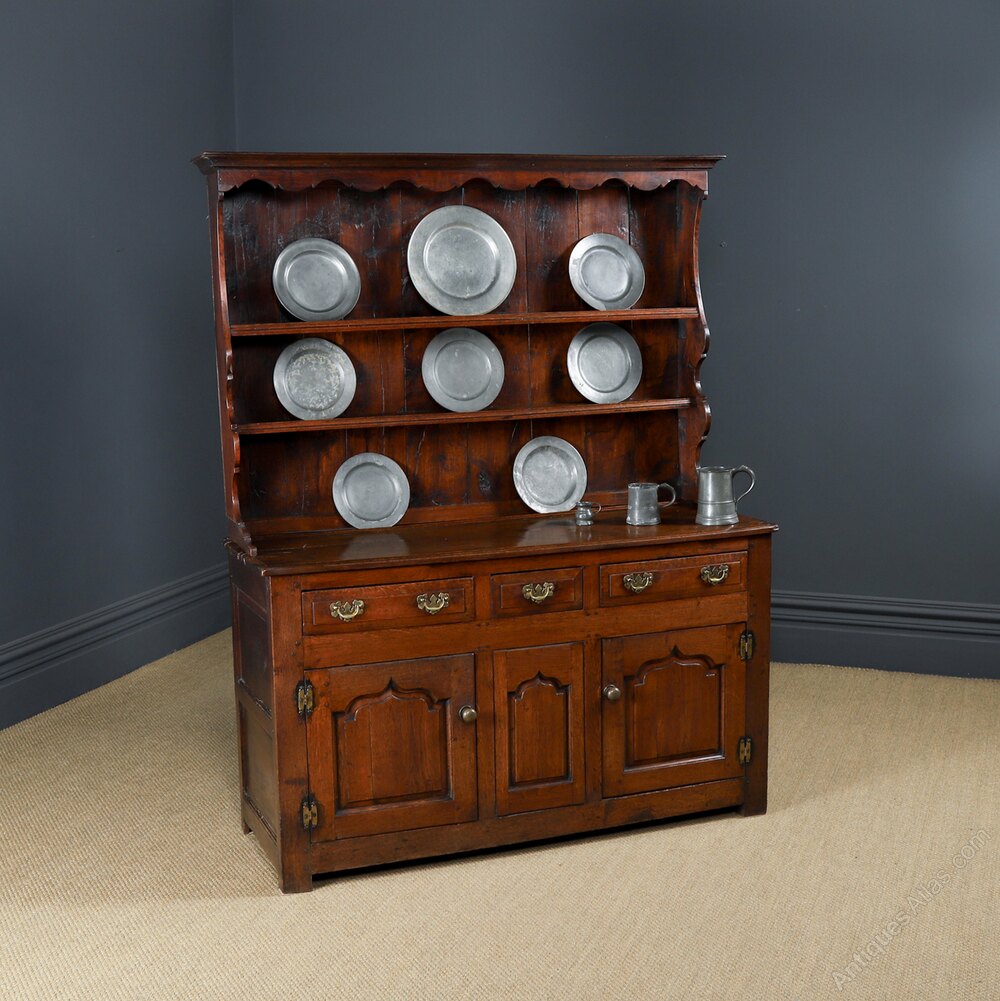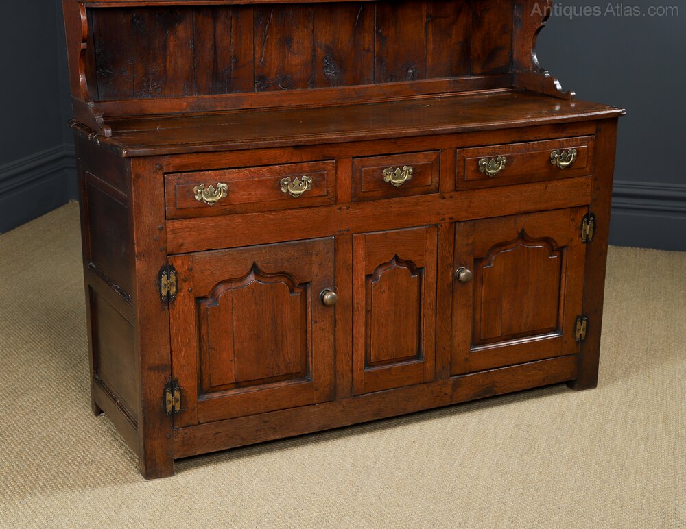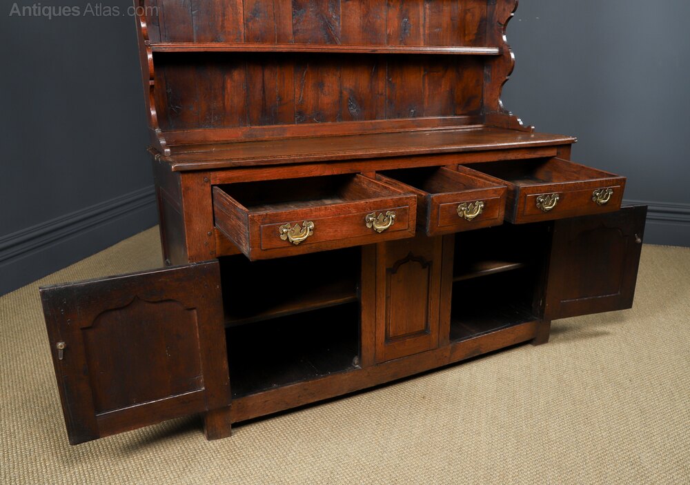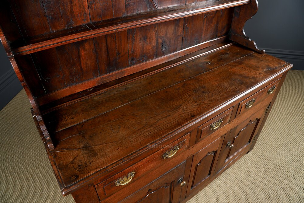 The Welsh dresser, a classic piece of kitchen furniture, originated in Wales during the 17th and 18th centuries. It typically features a sideboard-style base with cupboards and drawers, topped with open shelves for display. While the name suggests a Welsh origin, these dressers were also popular in Ireland and Scotland, with regional variations adapting to local needs. This particular oak dresser originates from the originating from the Snowdonia / Conwy region, in the county of Caernarfonshire in North Wales, United Kingdom. It is an early dresser boasting stunning colour and patination, constructed with top quality oak. This style of dresser is highly sought after, decorative and functional items that would complement any country kitchen or dining room. This particular dresser came from a farmhouse, in Denbighshire, North Wales.