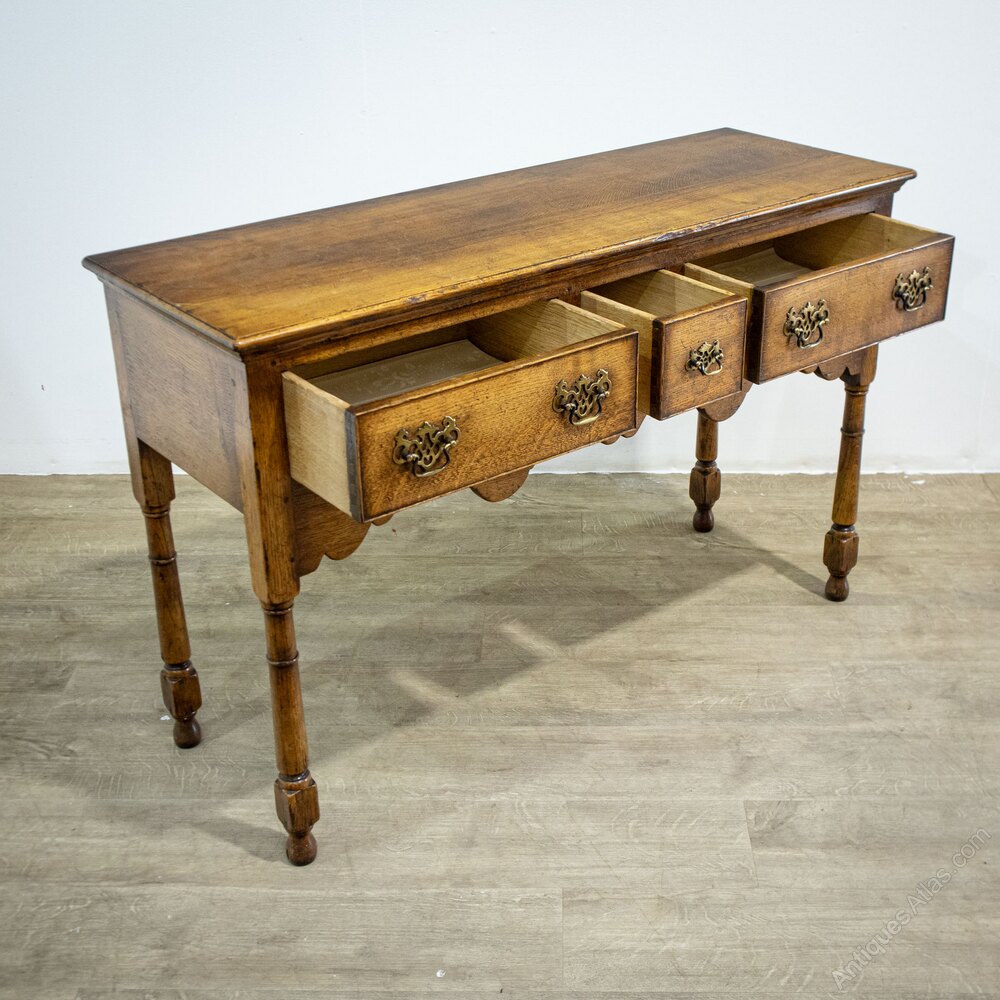 A lovely little oak dresser or sideboard, this late 20th century piece is of good quality construction and provides three drawers, two a good size and the central of a deep box shape.