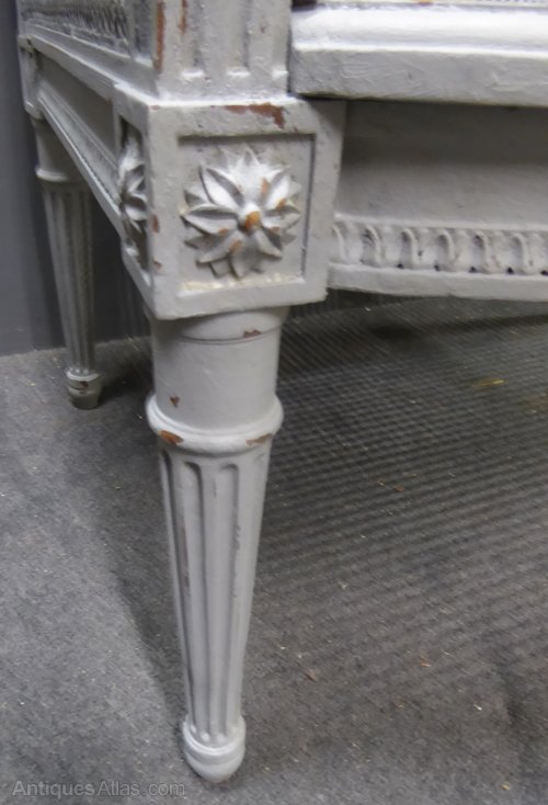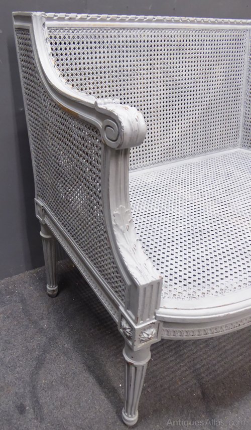 Ref 7031 - Small worn grey painted Louis XVI style antique French cane sofa. Cane in good condition with double panels to side and back. Circa 1900.