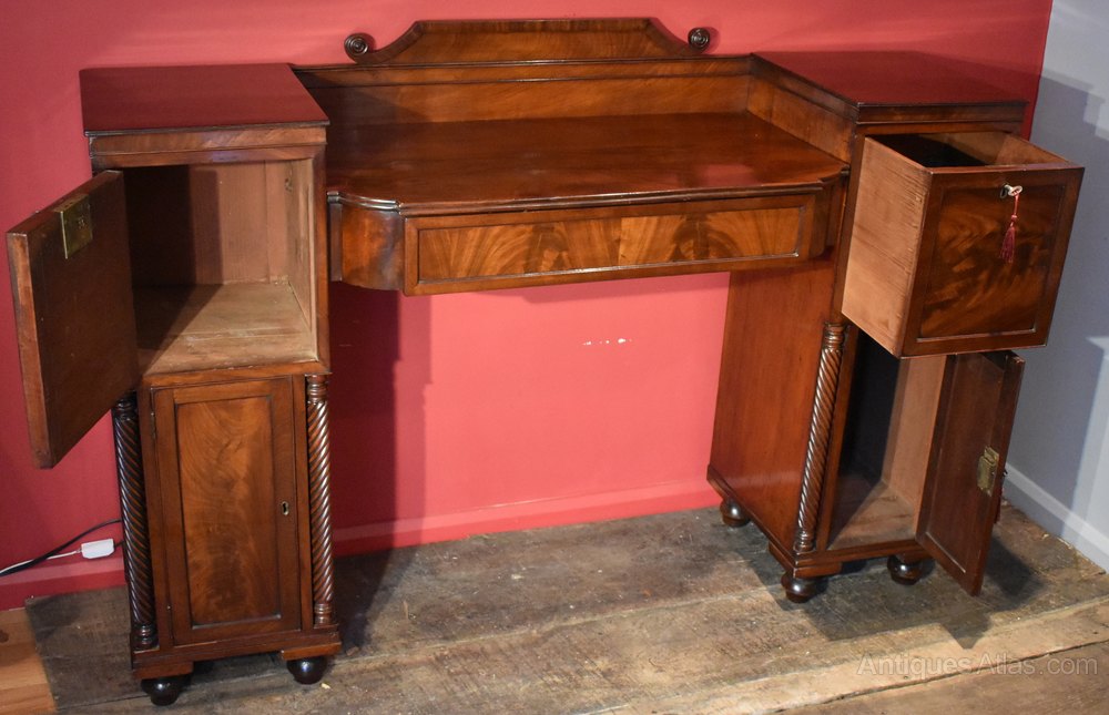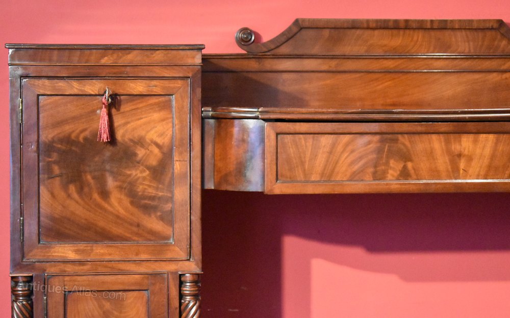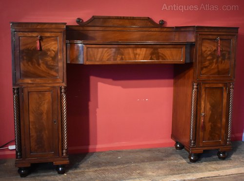 A fine and elegant Regency period pedestal sideboard. The sideboard is in flame mahogany with a wonderful figuring and colour to the timber. The pedestals each stand on turned feet with cupboard bases, flanked by twisted half columns. The top of the left pedestal is also a cupboard as the base, but the right has a wonderfully fitted cellarette drawer. The centre section has a single drawer and simple but elegant back board. The whole is in excellent condition with all working locks and the drawers slide freely. The sideboard is of such a small size and is so simple to take to pieces that it may well have been made as campaign antique furniture or perhaps naval. A fine piece of period furniture that because of the small size would work well in any position. C.1820.