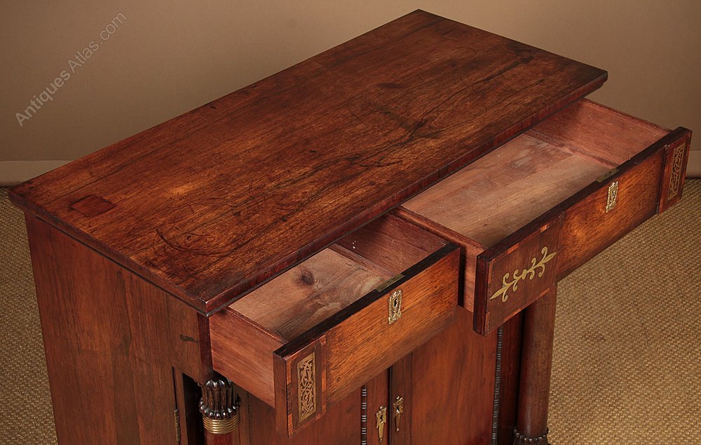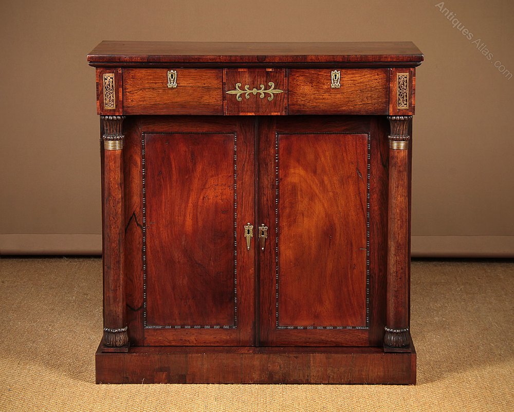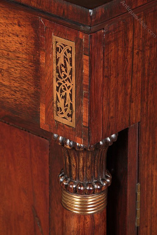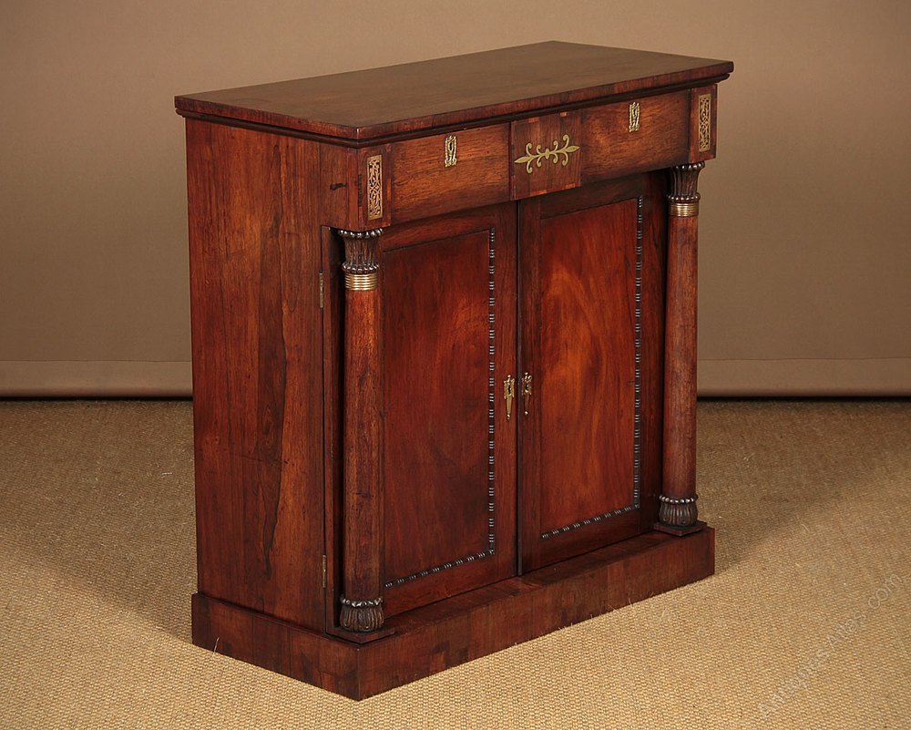 Beautiful little Regency era rosewood chiffonier side cabinet c.1820. Just 36″ wide with two drawers over a two door cupboard split into two halves with two shelves to each side (depth 12″), which can be positioned as required by sliding them in and out of the grooves on the sides. Well figured rosewood veneers across the top, front and sides. Inlaid brass fretwork either side of the drawers and at the centre, with crossbanded surrounds. Unusual brass escutcheons to the drawer and doors. Solid flame mahogany door panels within rosewood veneered frames flanked with splendid applied columns (which open with the doors allowing them fold flat) with carved terminals and brass mounts. Raised on a square plinth. Some old marks and patched repairs to the top, plus minor repairs to the crossbanding. Generally excellent condition and particularly good original colour. Restored, cleaned and waxed in our workshops. Key supplied.