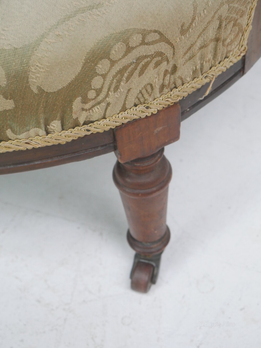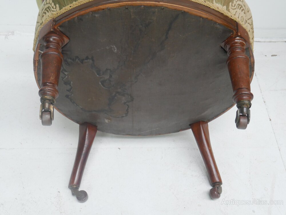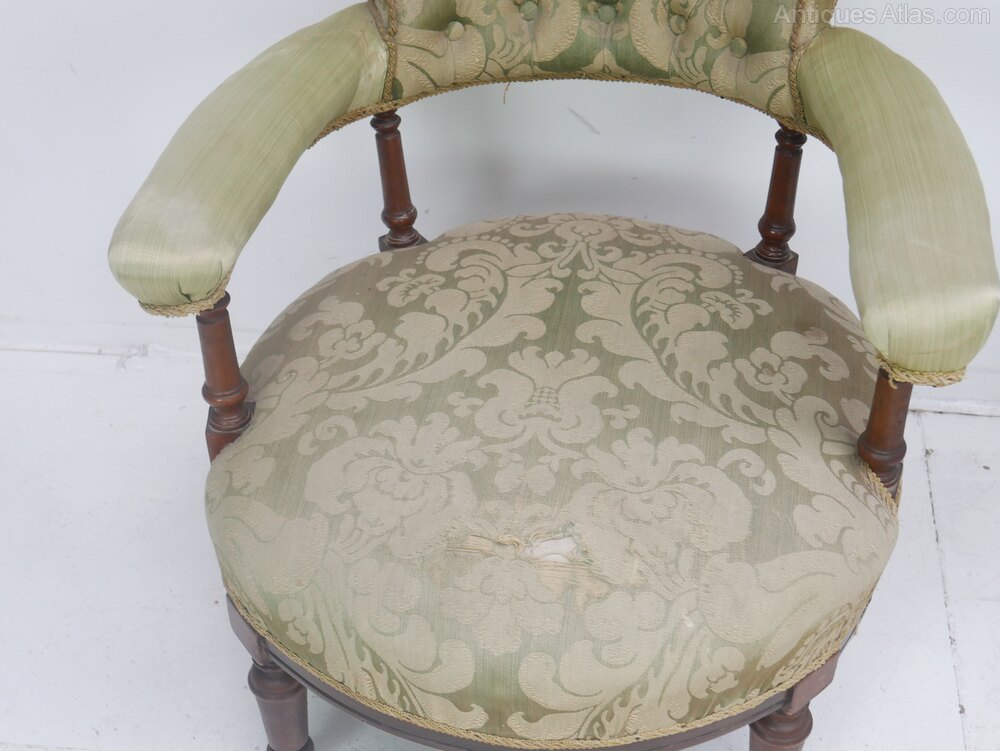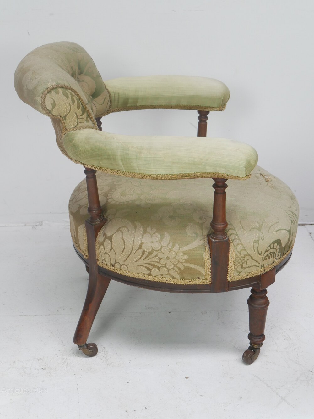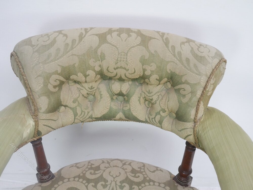 A charming small late 19th century armchair for upholstery. A well designed chair in walnut with turned front legs and a good kick to the back legs, no repairs all firm with the original castors. The chair has a well shaped buttoned back, comfortable seat seat, for upholstery with a seating height of 36cm.