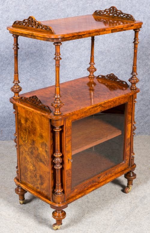 A Victorian burr walnut cabinet whatnot. The top having fretted galleries to each end and is supported on 4 turned columns with conforming galleries to the lower tier. The cabinet with matching turned columns and having a single glazed and lockable door with a shelf interior. The cabinet stands on 4 turned legs with brass and brown pot casters. This cabinet would make an ideal hi-fi stand. Dimensions:- Height inc. galleries…43.5’’/ 110.5cm. Width…26’’/ 66cm. Depth…16’’/ 41cm. Height between shelves…13.75’’/ 35cm. Delivery to most of U.K. mainland £45.