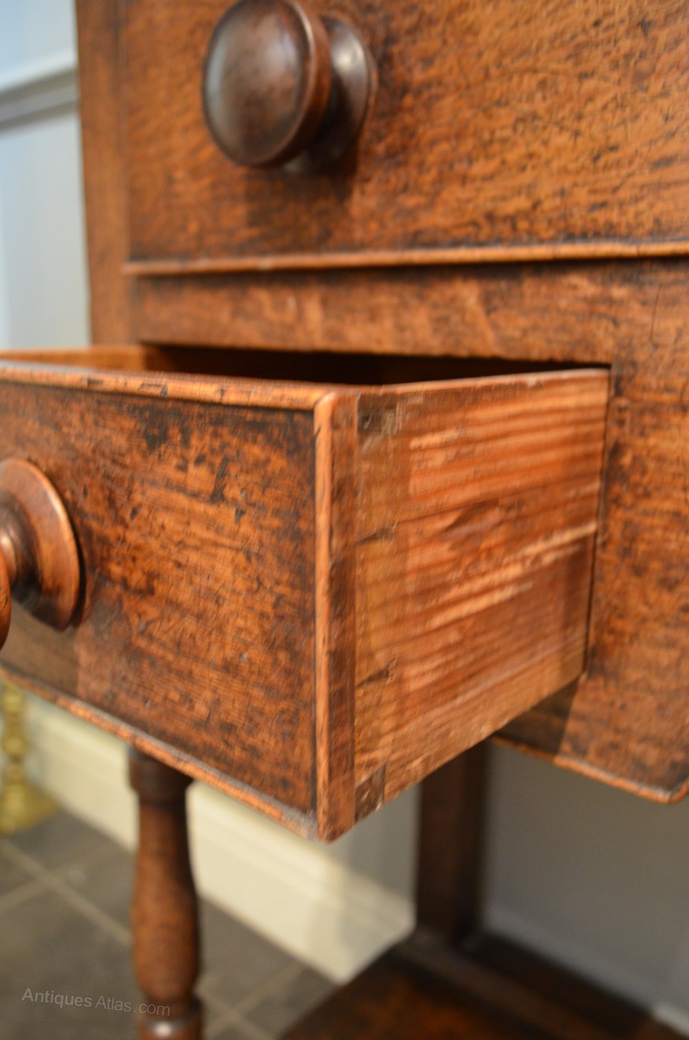 Turned pillars to the front and shaped arches beneath the arrangement of drawers.