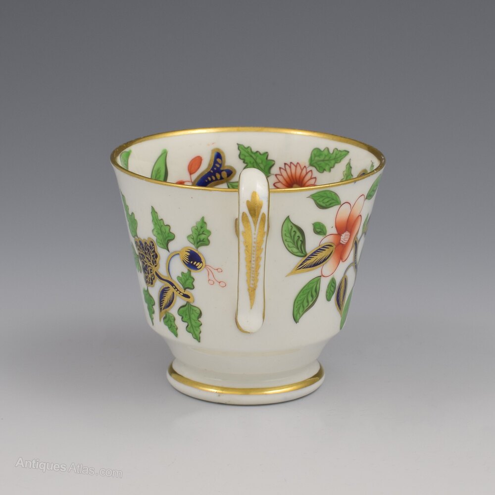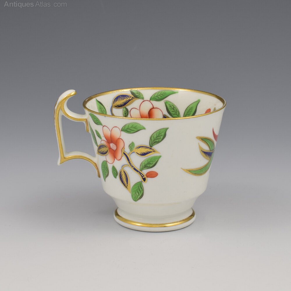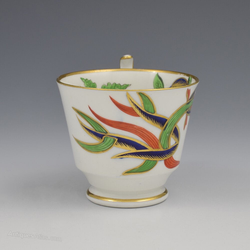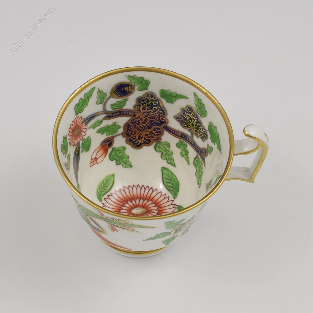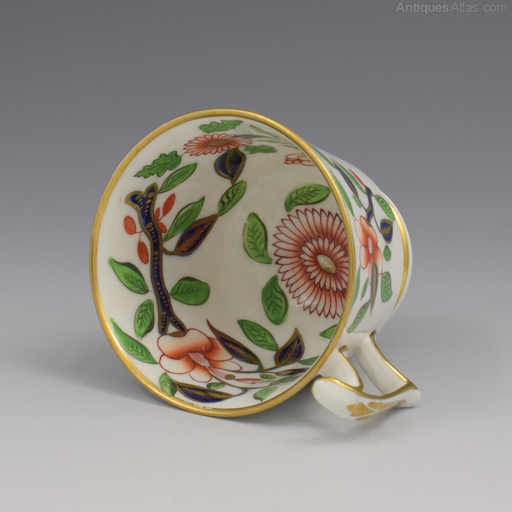 Gorgeous Georgian Spode bone china coffee cup and saucer, in the London shape, decorated with a bold oriental pattern in a simple imari palette of green and iron red enamel, underglaze blue and lots of gilt ornamentation. Peony flowers, chrysanthemums, bamboo and other exotic stylised flowers and foliage. The entire inside of the cup is decorated as well as the outside, a further testament to the skill of these artists, and both pieces are finished with thick gilt rims and sides of the handle, finished with a stylised acanthus leaf. Both pieces marked SPODE in red enamel and the cup also bears the pattern number 2215, c.1815.