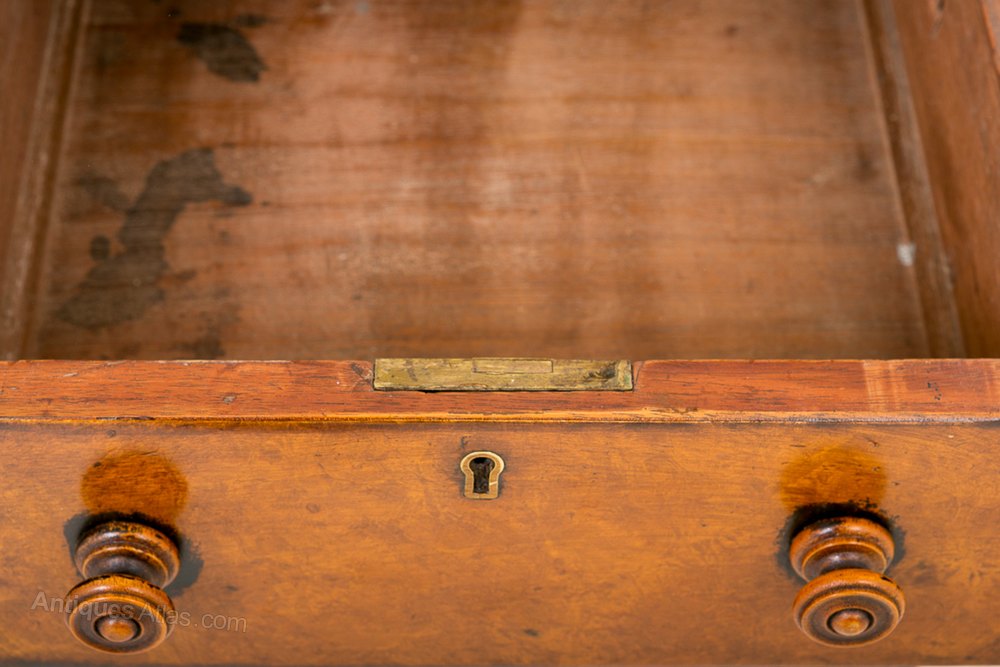 The interior featuring a pull out slide with an adjustable writing slope and an arrangement of drawers and pigeon holes.