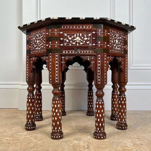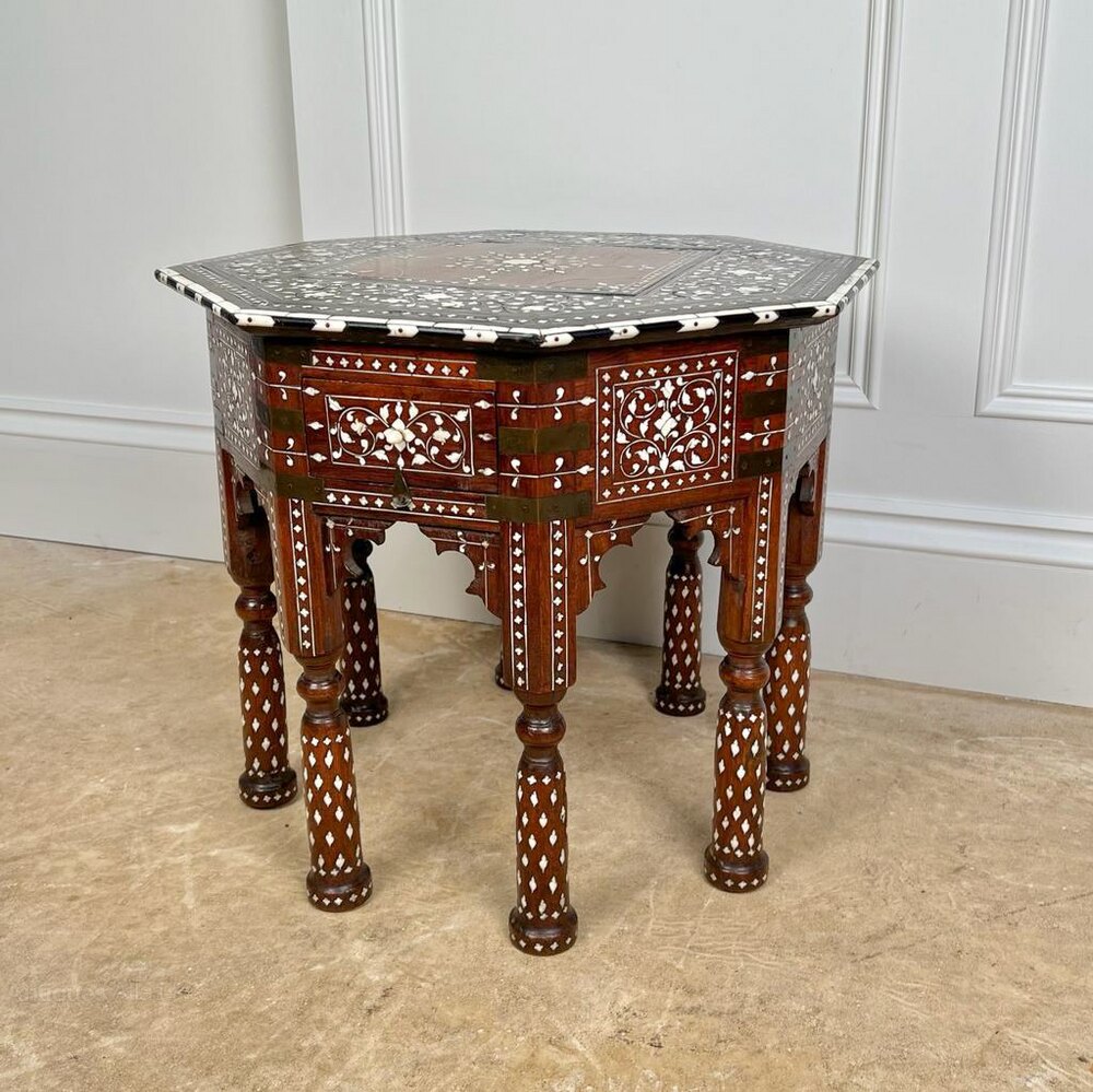 A super 19th century Hoshiarpur table with a single drawer. Having an octagonal top and raised on 8 turned shaped legs, the whole profusely inlaid in ebony and bone with brass strap work decoration. Well proportioned, lovely original condition and finish throughout. Indian, Circa 1890.