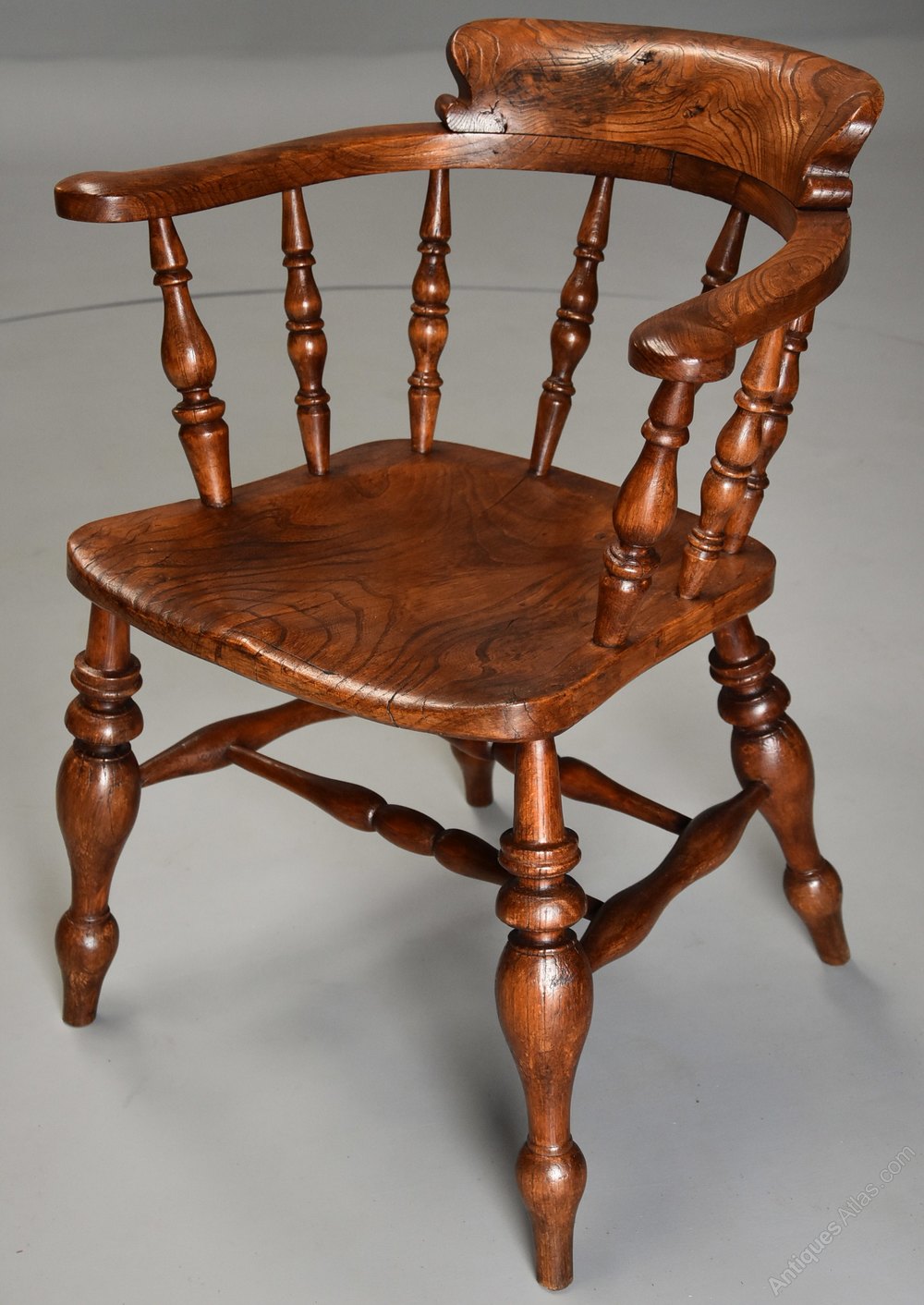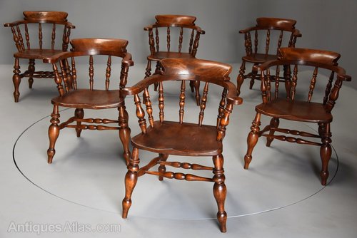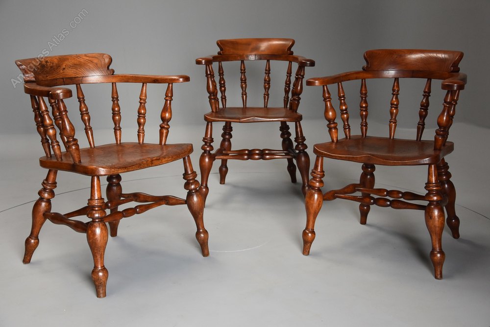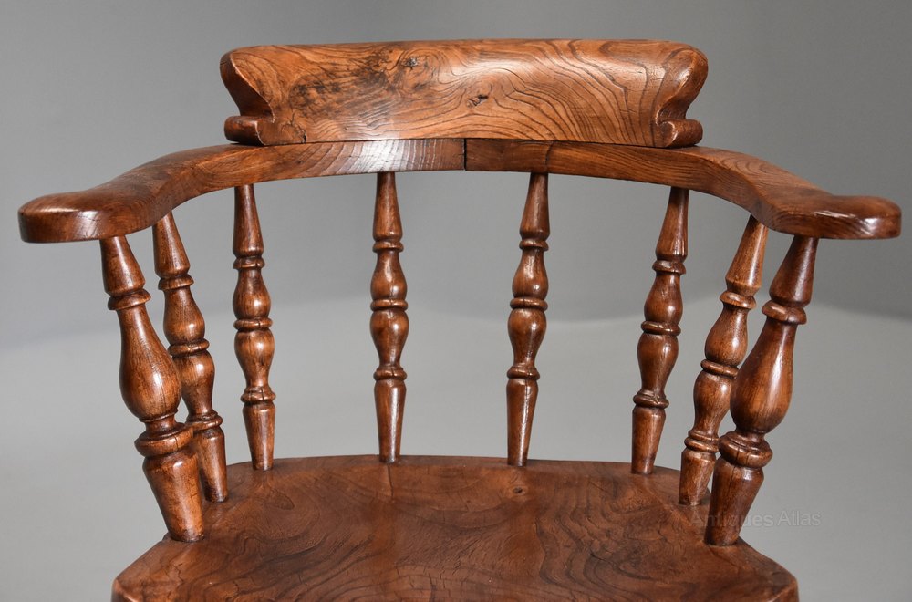 This style of chair was known as a smokers chairs, office chair or Captains chair and are possibly one of the most comfortable wooden seated chairs due to their design. They were often found in offices, men's clubs and pubs due to their robust structure and were produced in many areas in England.