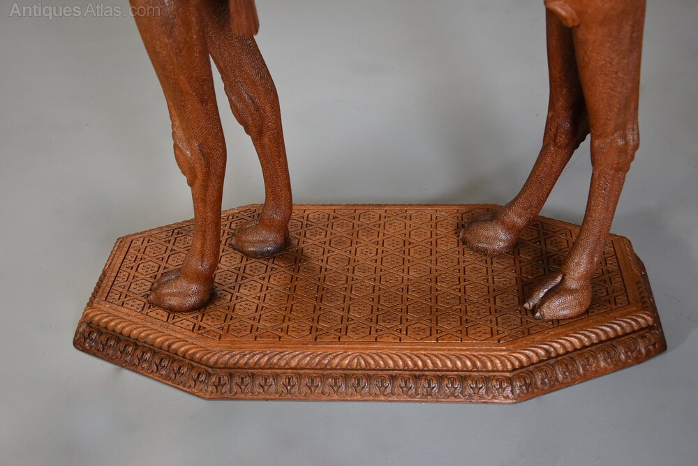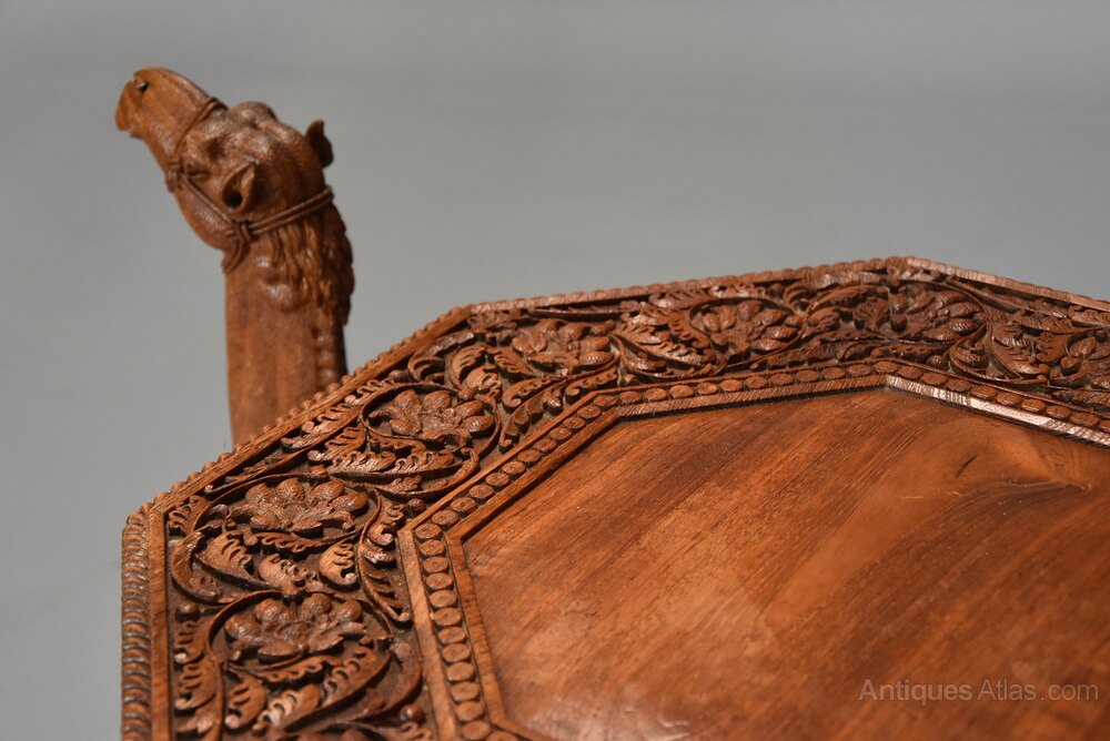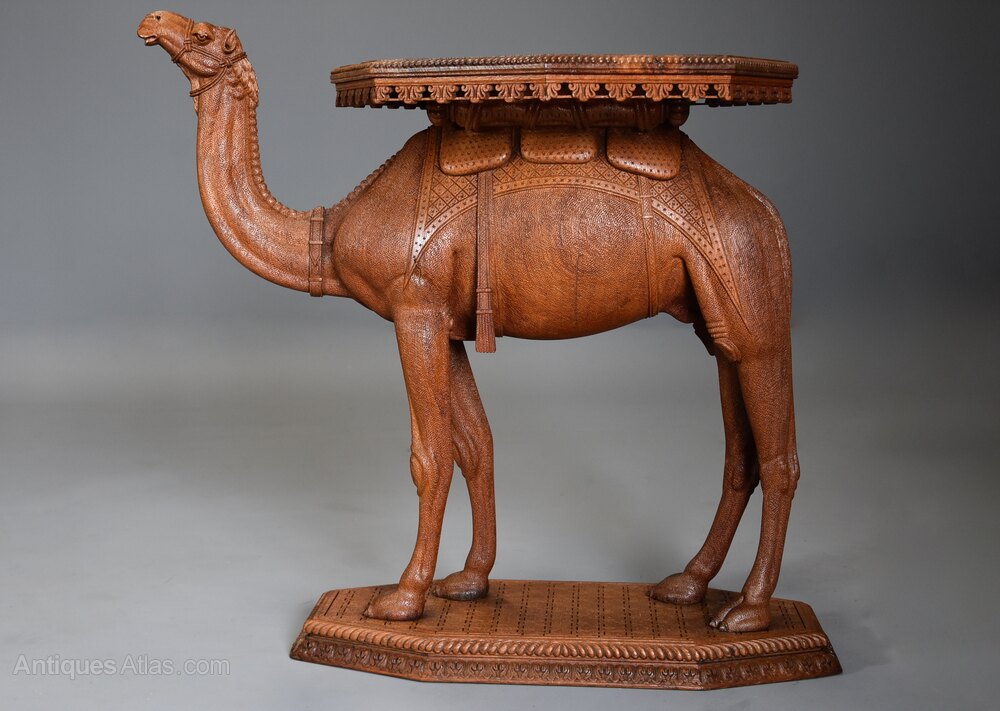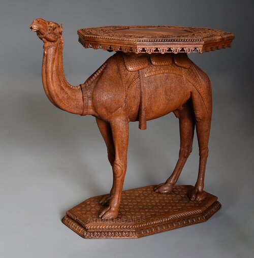 The table top is fixed to the superbly carved camel body with carved saddle and rug on his back leading down to the camel base having a carved geometric design with gadrooned edge.
