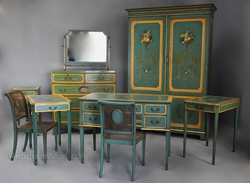 This large bedroom suite consists of a double fitted wardrobe, dressing table, chest of drawers, pair of side tables, bedside cabinet, one or two chairs and a table mirror all painted in a green/teal tone with painted decoration – some colours have oxidised over time.