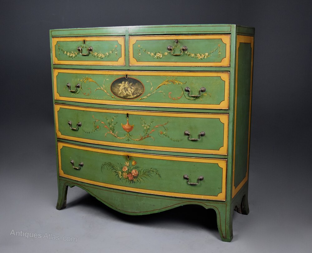 Chest of drawers – this chest is of bow front form with painted top leading down to five cockbeaded drawers with oak linings, two short over three long drawers with brass swan neck handles and key. The drawers all with superb painted decoration in the Classical style consisting of floral and foliate designs, two cherubs in an oval panel and a painted urn leading down to a shaped apron, painted panel designs to the sides and supported on out swept feet.