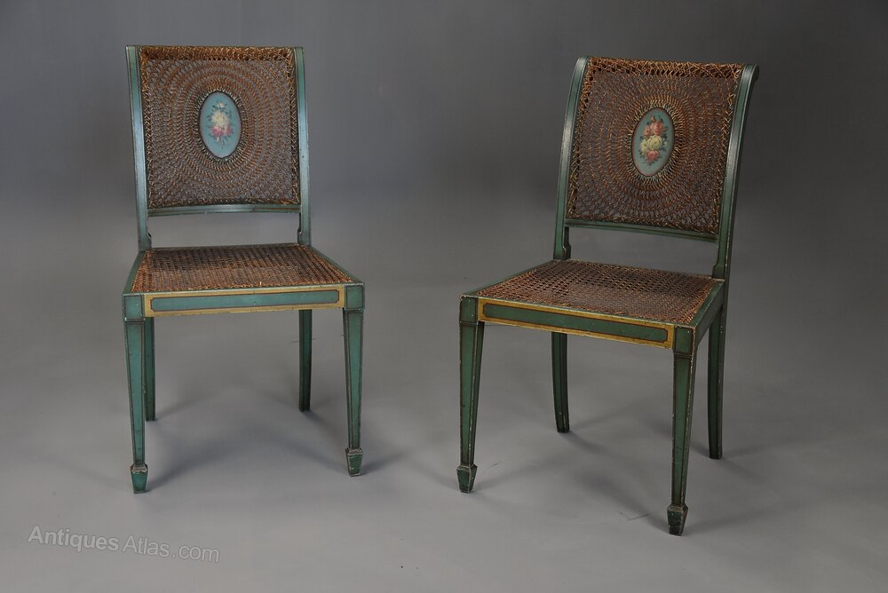 The chairs each consist of a shaped caned back with central oval painted floral panel leading down to a caned seat supported on tapered legs to the front with spade feet and out swept legs to the back.