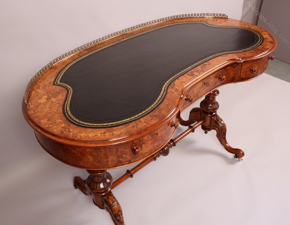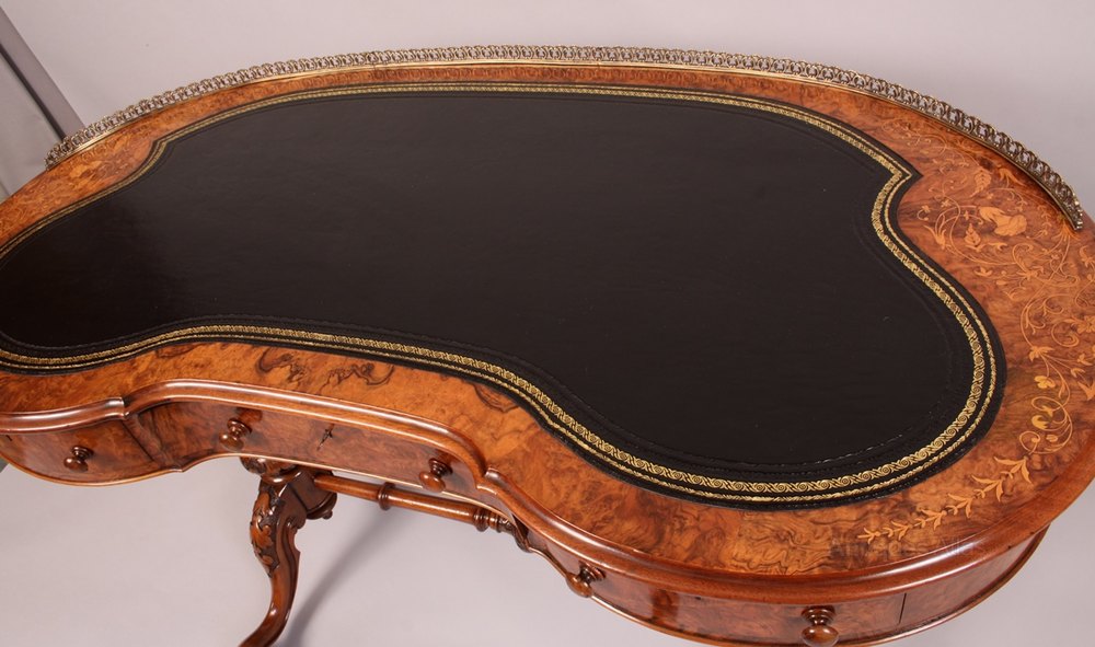 A Superb Kidney shaped desk in Burr Walnut with inlay by the London Cabinet Making Firm of DRUCE and Co of Portman Square, with three drawers and pierced brass gallery.
