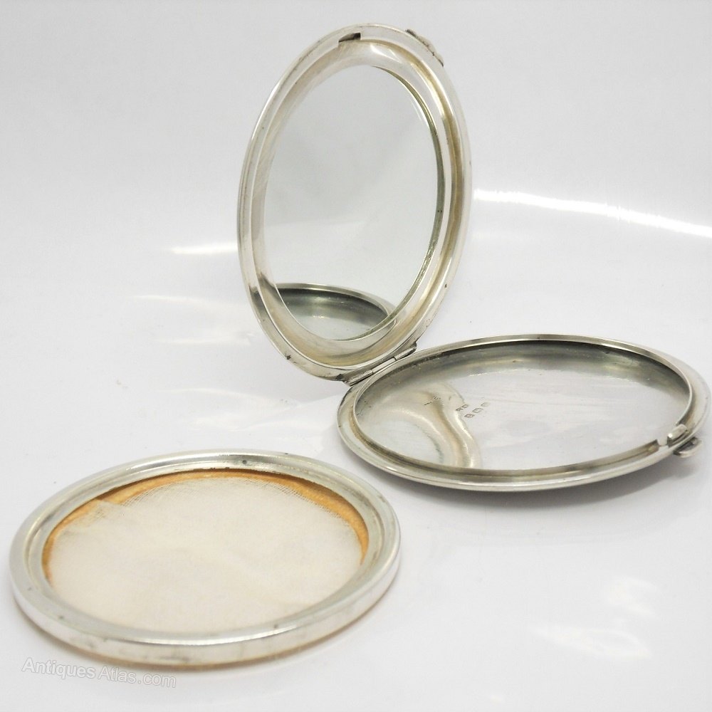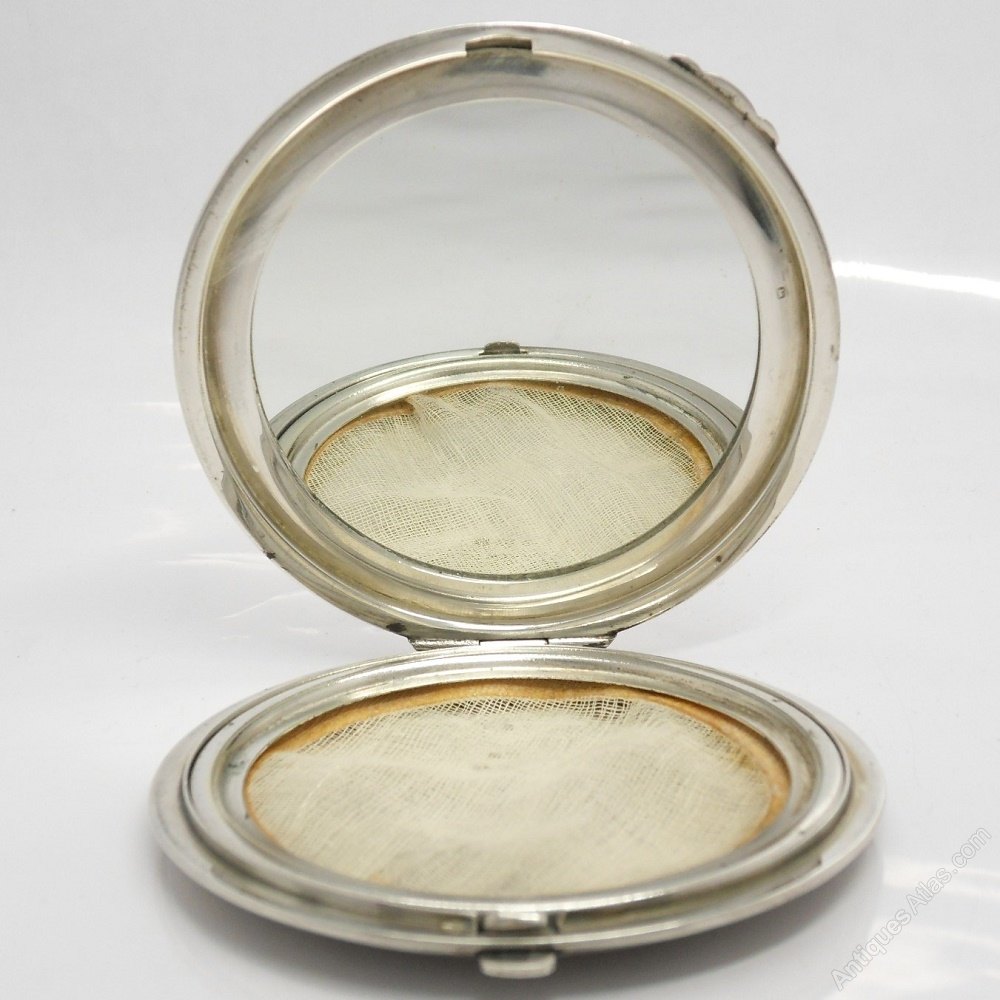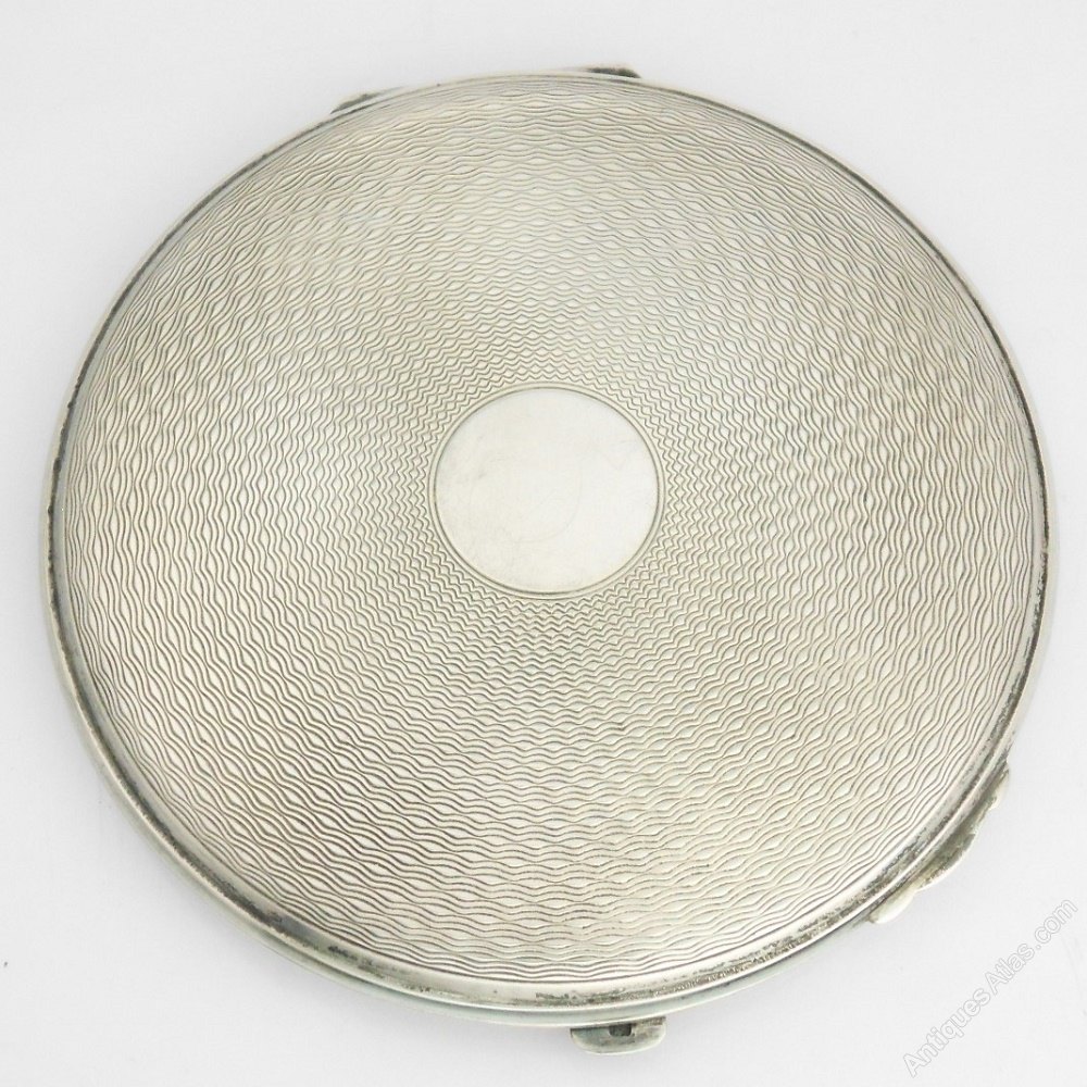 A very attractive circular compact, beautifully designed both front and back in an engine turned star burst pattern. When opened the compact reveals a clear mirror underneath the lid and still retains the gauze cover for the powder compartment. Hallmarks are visible under this gauze cover for Birmingham 1946 , with silver maker's mark: Crisford & Norris.