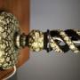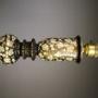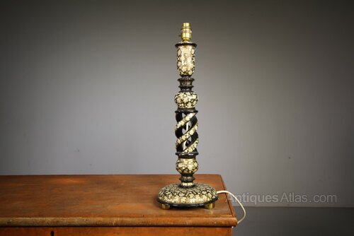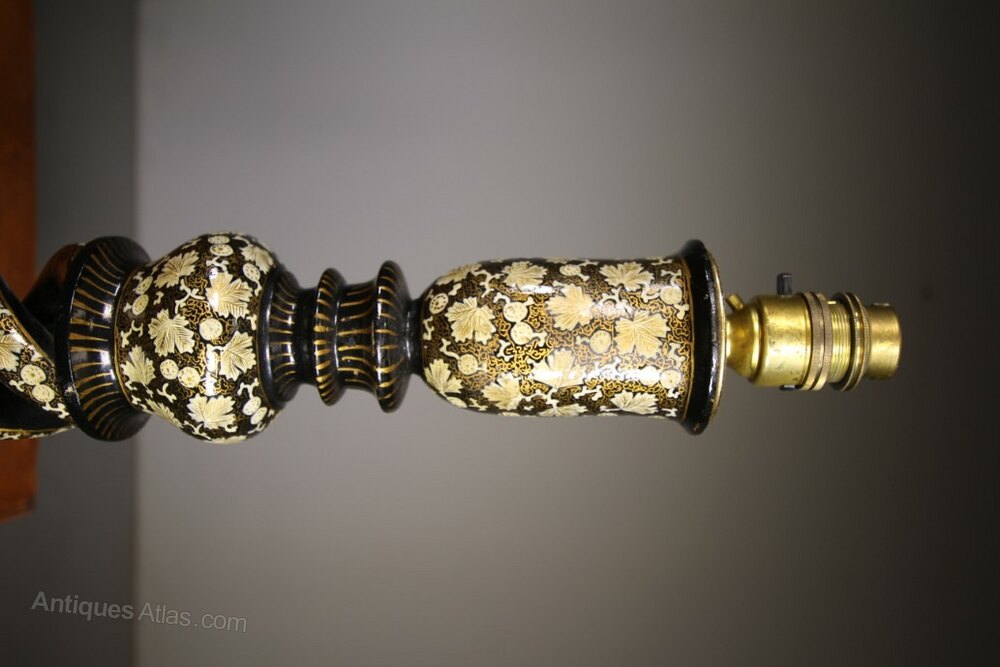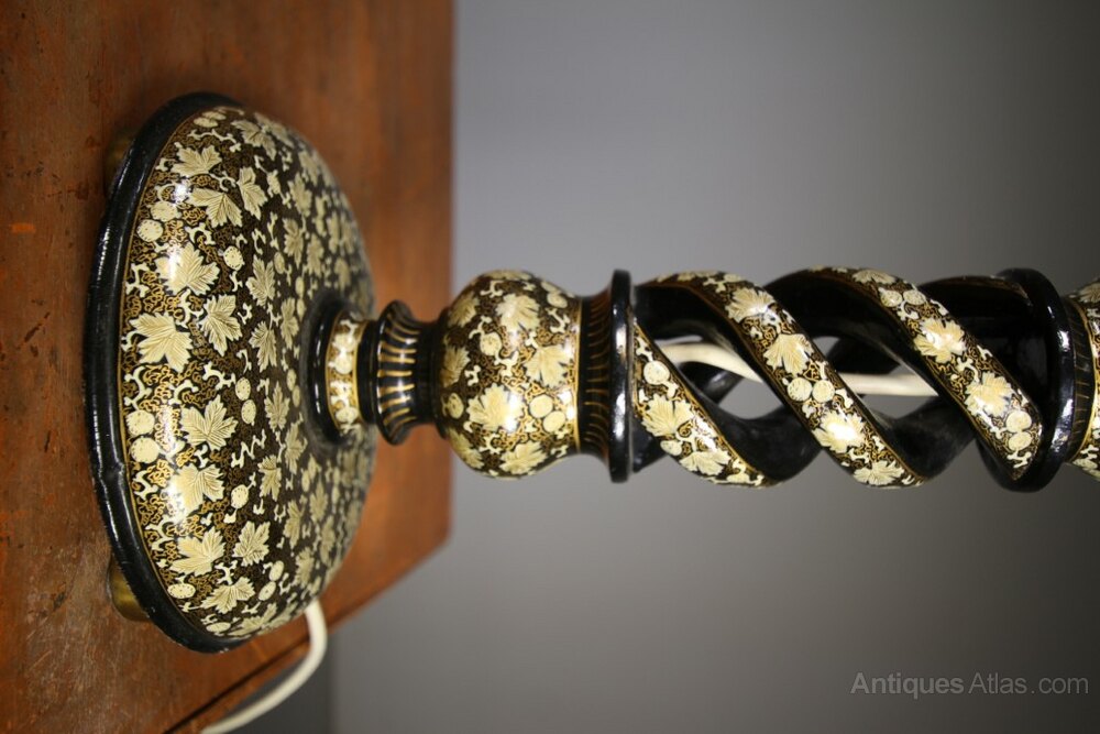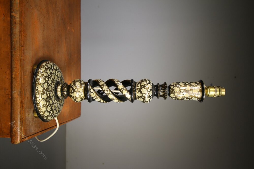 A very decorative tall antique Kashmiri table lamp that has a lovely open twist to the stem and stands well on a circular base with brass feet. The hand painted cream, gilt and black Kashmiri decorations are all very intact and bright. Newly re-wired, a lovely piece.