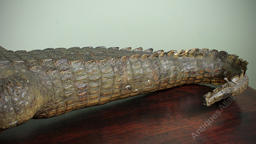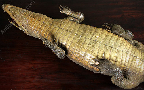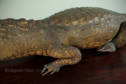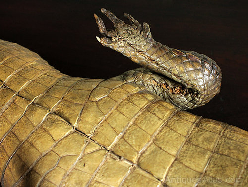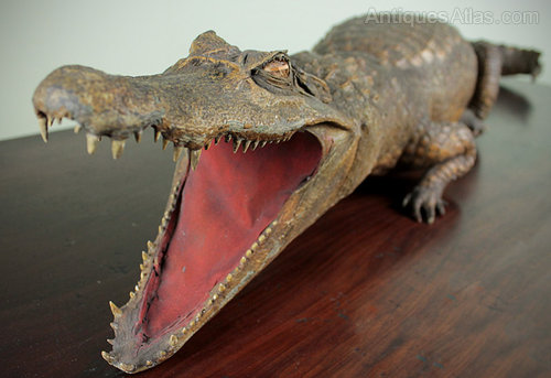 Toothsome Edwardian era taxidermied caiman c.1910. Good quality and naturalistic taxidermy presented in dramatic jaws open pose. Good condition with minor damage to the toes and missing the very tip of his tail.
