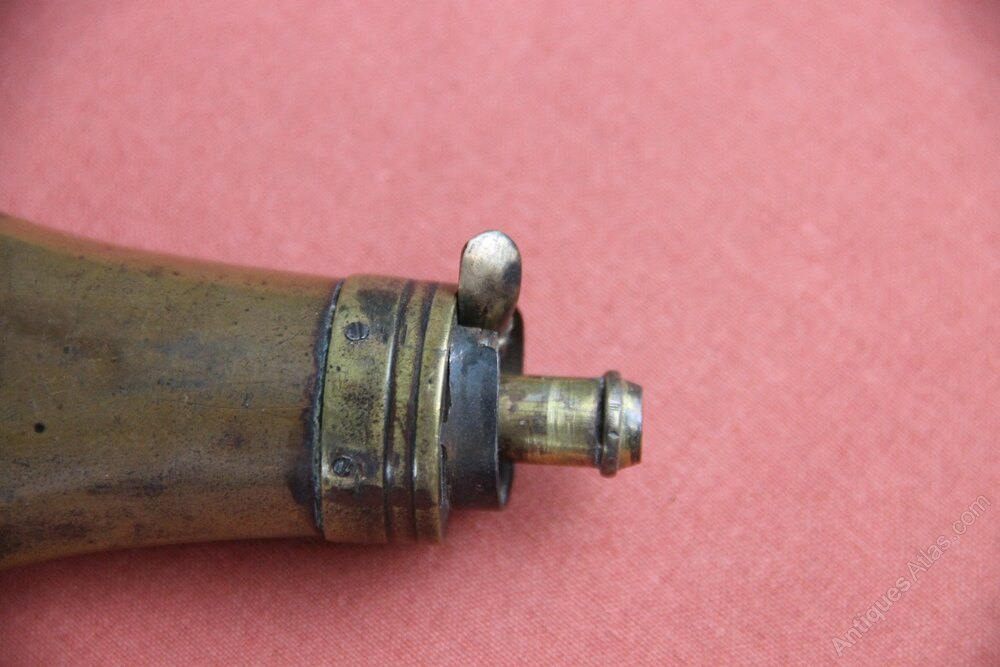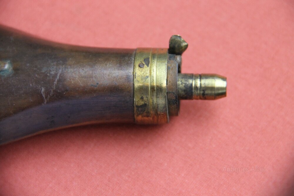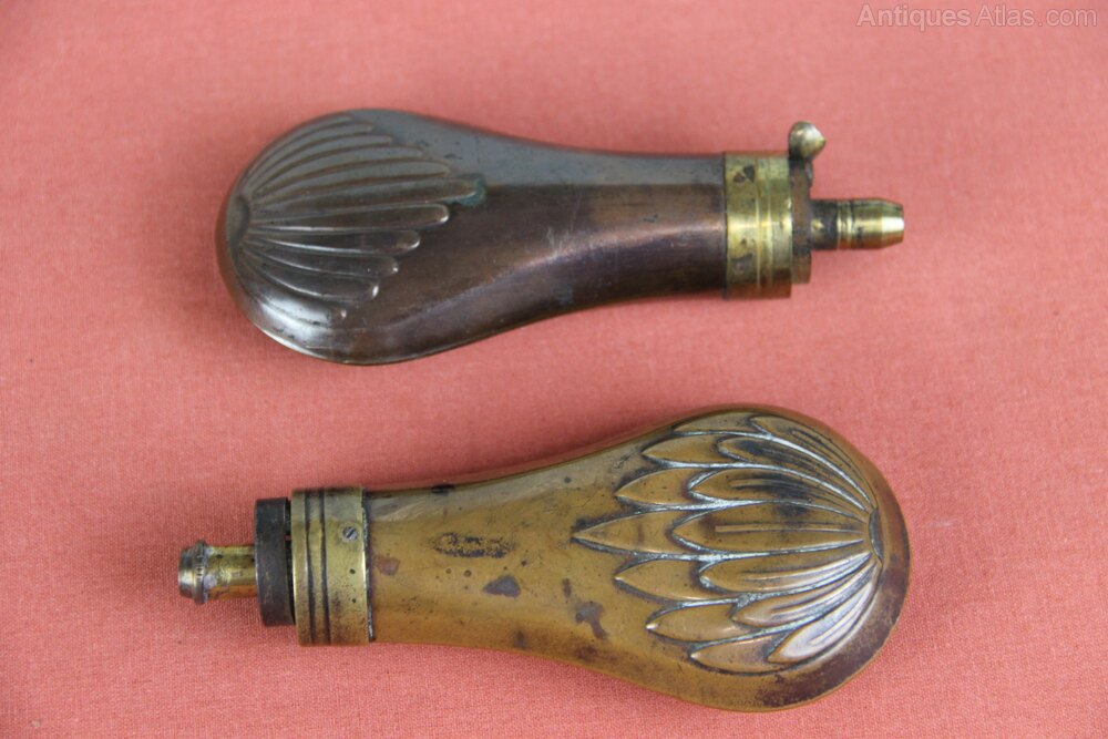 Two small copper pistol flasks, one 19th century and one later. Both have some of their original lacquered finished and both have working springs. Both in good overall condition with slight denting.