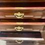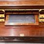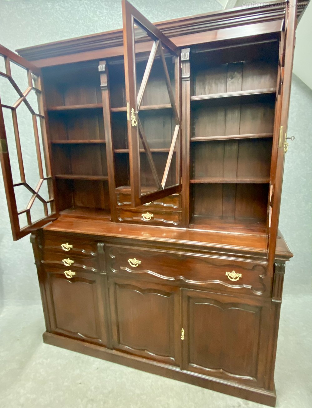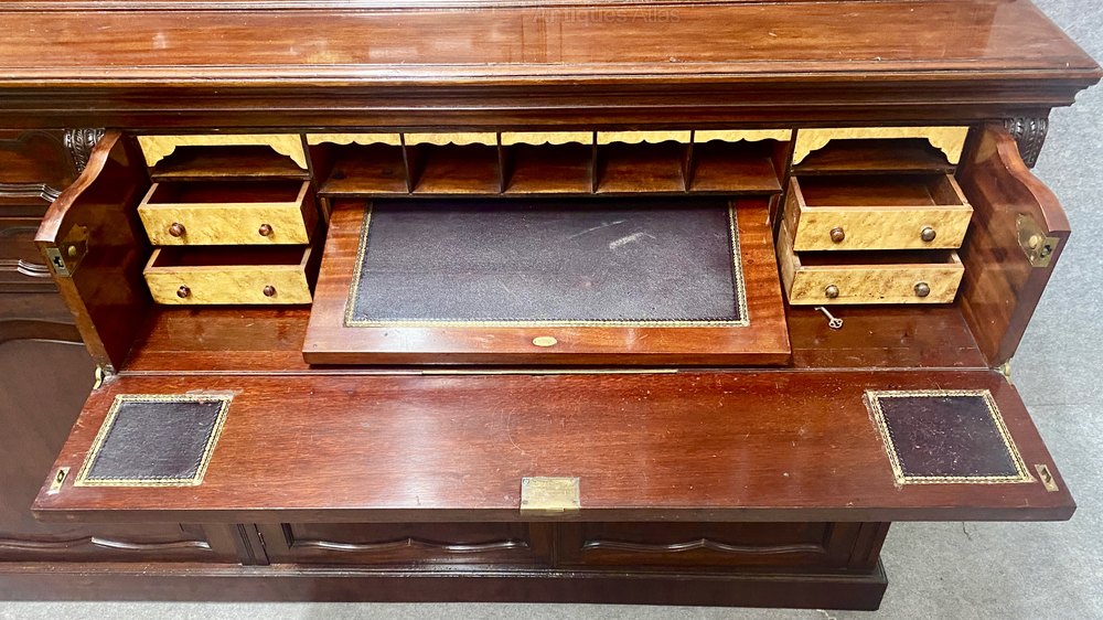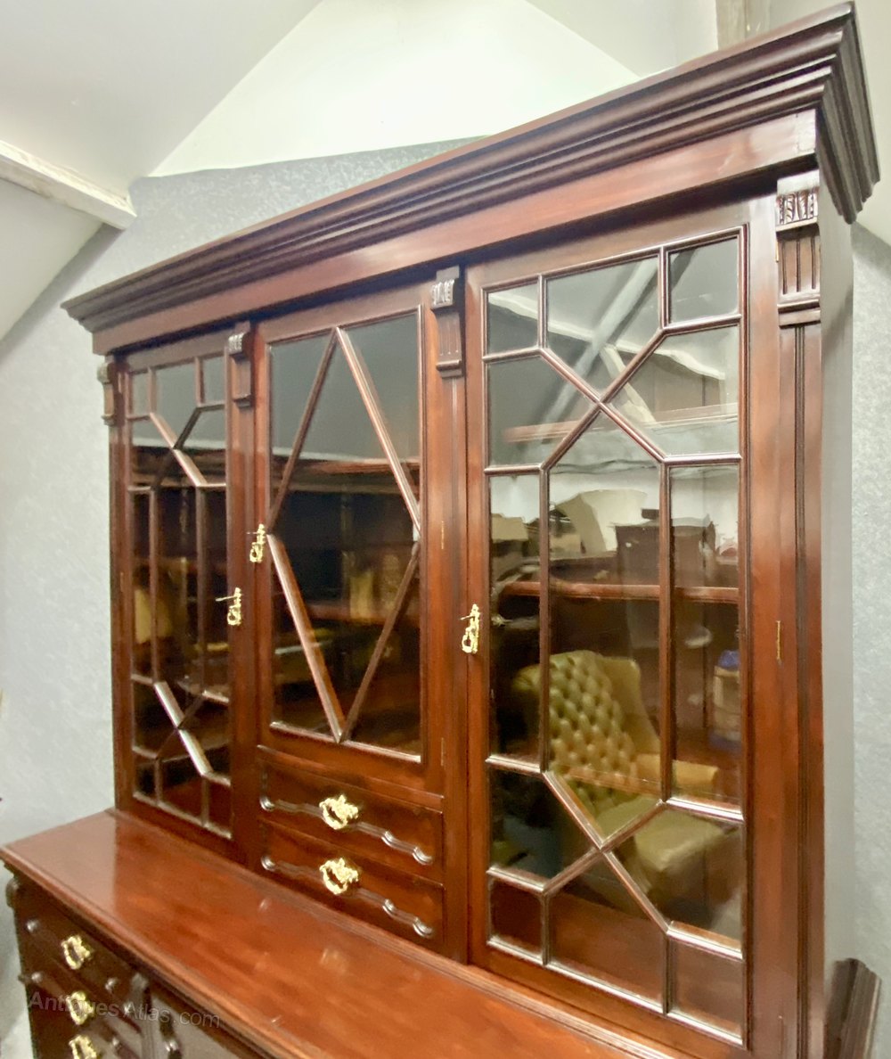 A good quality late 19th century solid mahogany 3 door secretaire bookcase of an unusual form. The moulded cornice above 3 doors with the centre having diamond shaped astragal glazing bars above 2 drawers and flanked by 2 full length doors each having thirteen pane astragal glazing bars. The base section having a well fitted secretaire drawer to the right and centre which opens to reveal 4 birds eye maple veneered drawers, 5 small pigeonholes and 2 large pigeonholes. The reading or writing slope slides backwards when not in use and retains the original tooled leather writing surface. To the left are 2 drawers above a port folio drawer disguised as a door next to the 2 true doors and all with shaped fielded panels. The whole retaining ornate gilded brass handles and escutcheons with working locks and keys. The drawer fronts are all recessed from solid mahogany and have good quality solid mahogany linings. The moulded stiles having well carved corbels and the whole raised on a plinth base. Dimensions:- Max.Height…91.75’’/ 233cm. Width…72’’/ 183cm. Depth…19.25’’/ 49cm. Delivery to most of U.K. mainland £120.