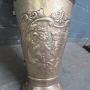 Unusual brass log bin / stick holder dating from the 1930s. It is in the form of a French grape Hod . With a taper form shape with a large rear embossed arch . There are four brass mounting to the back as strap holders . The front is also embossed with lions supporting a shield, the top back has serpents and floral design. possibly French,