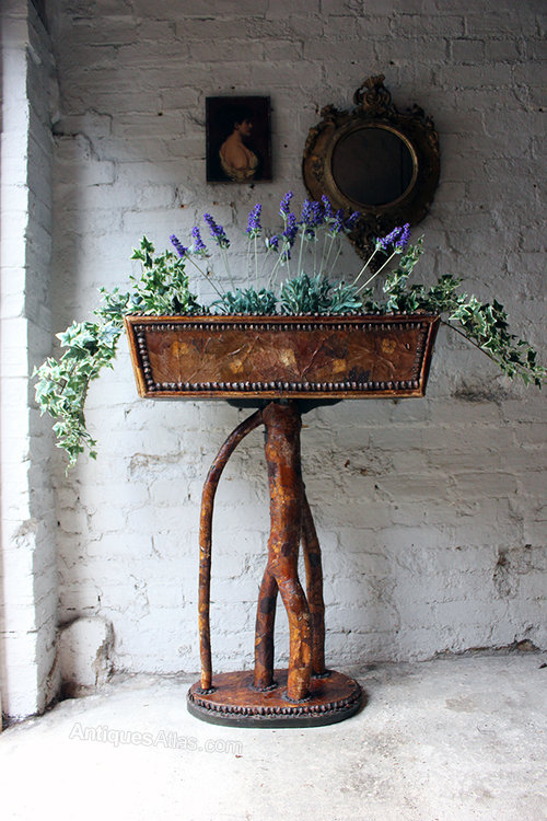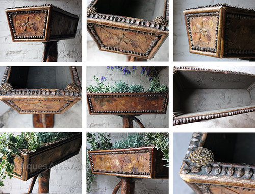 The jardinière stand remains in good overall condition. There is a handful of small losses to the decoration and some peeling here and there but 80-90% is in tact. The trough has remnants of old compost which has dried to the metal lining (zinc?) base but in no way proves a problem. The piece remains structurally very sound.