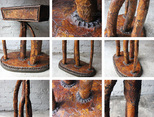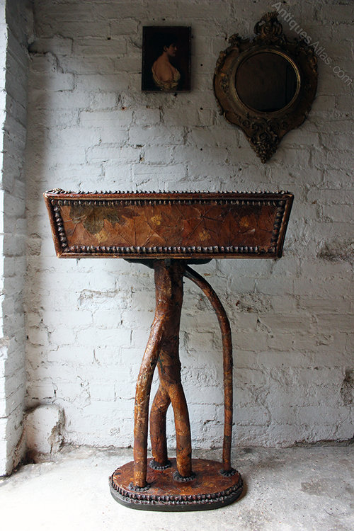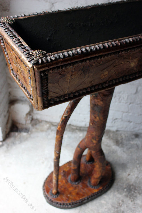 The unusual Victorian fernwork floor-standing plant trough jardinière stand, decoupage covered with botanical specimens of the day to include several species of dried leaves indigenous to Britain, the ground mainly made up of oak leaves, with pine cones and at least three other differing specimens, the specimens covering the entire carcass, the metal (zinc?) lined trough on a sinuous naturalistic twig work support to an oval base, and the whole surviving from mid-Victorian England.