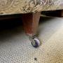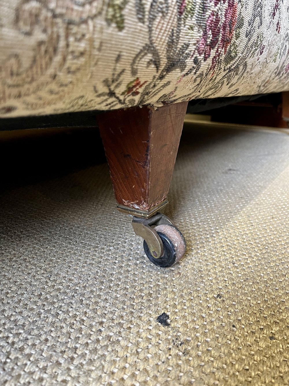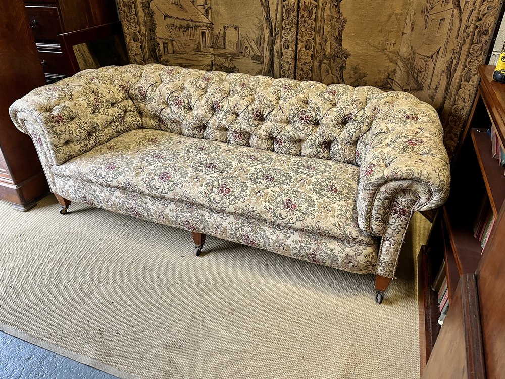 On a grand scale, being 7ft wide. Standing on 5 square tapering legs with original brass casters.