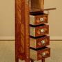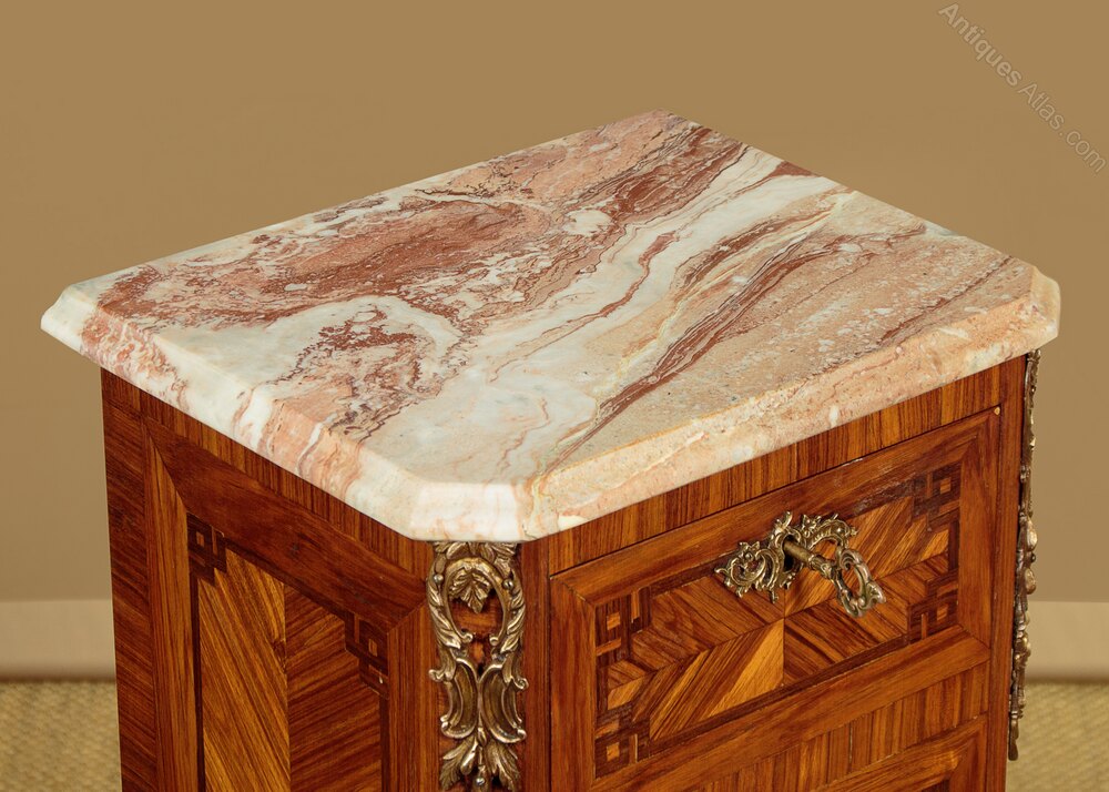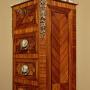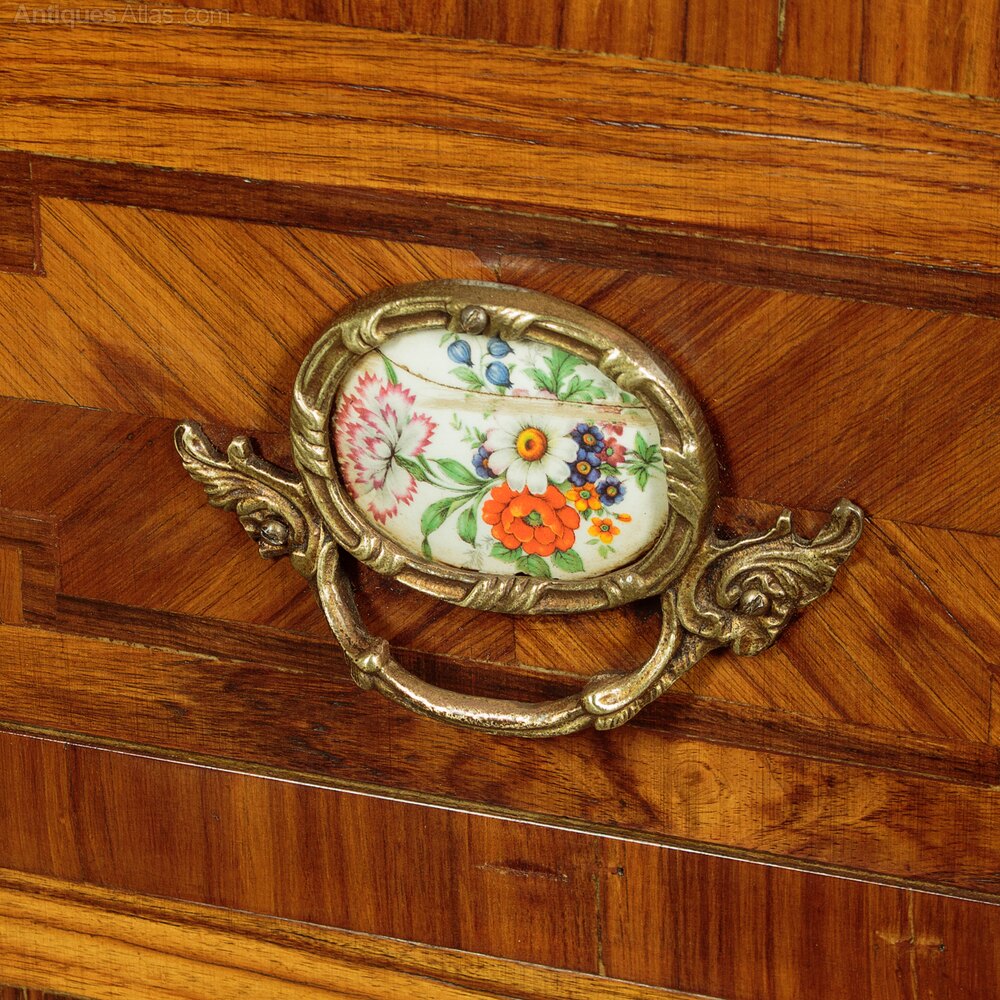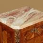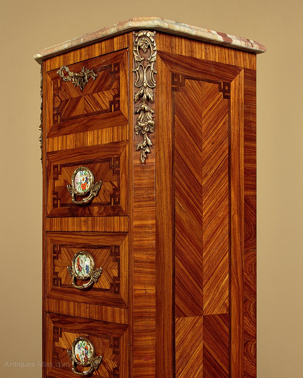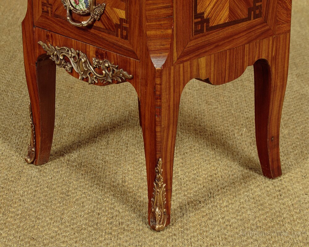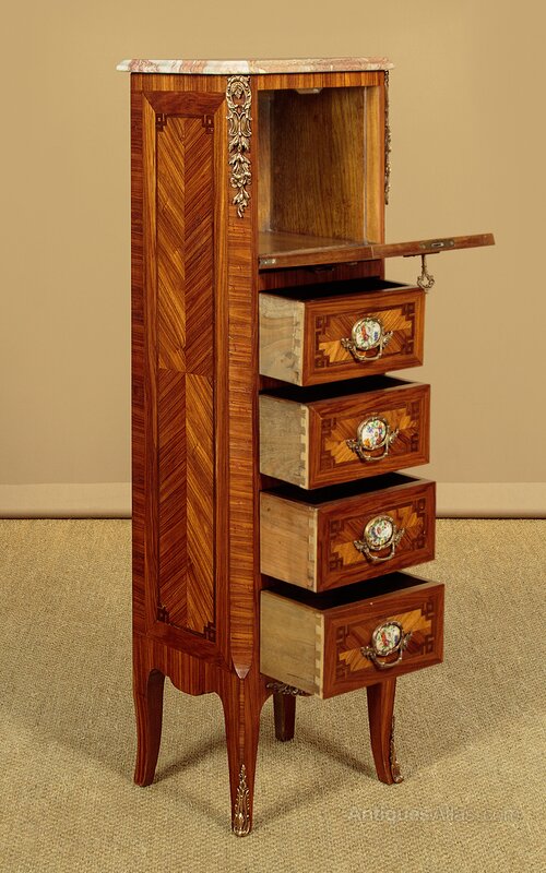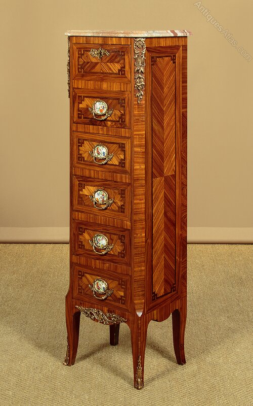 Neat little French parquetry bank of drawers c.1930. Unusual slim dimensions, just 14" wide. Well figured marble top with canted corners and a moulded edge. Over a lockable fall front cupboard (9"x 9", height 10") and four small drawers. Striking parquetry work exterior in tulipwood veneers. With pierced brass mounts and brass handles with pretty porcelain plaques at centres. Shaped apron and feet, also brass mounted. Cracks to a couple of the porcelain plaques, otherwise excellent colour and condition. Cleaned and waxed in our workshops. Key supplied.