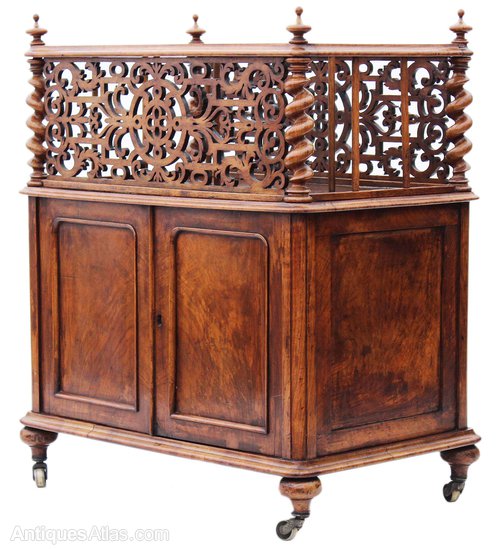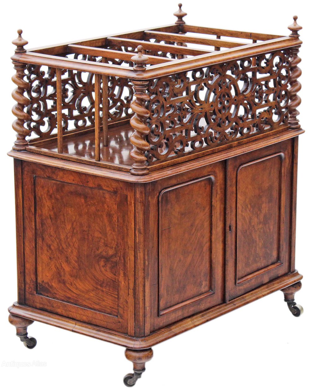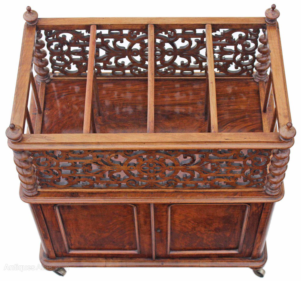 Antique Victorian 19C walnut Canterbury or magazine rack with a cupboard.