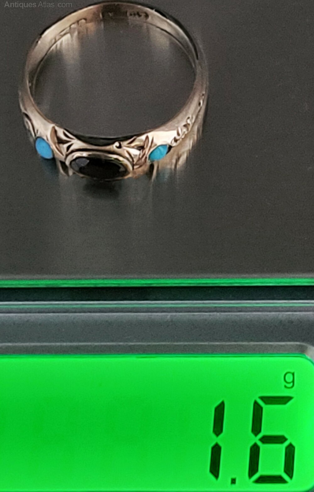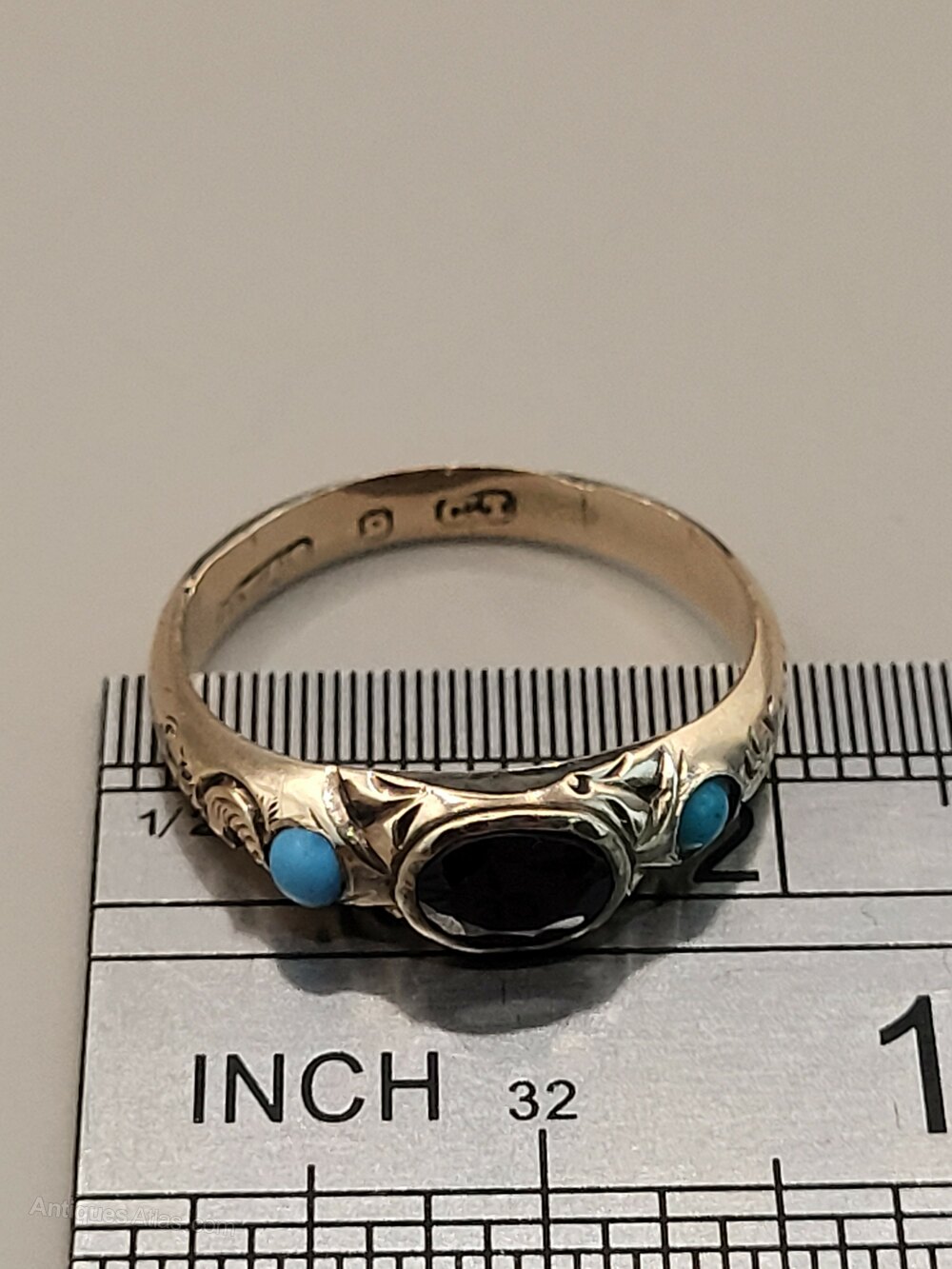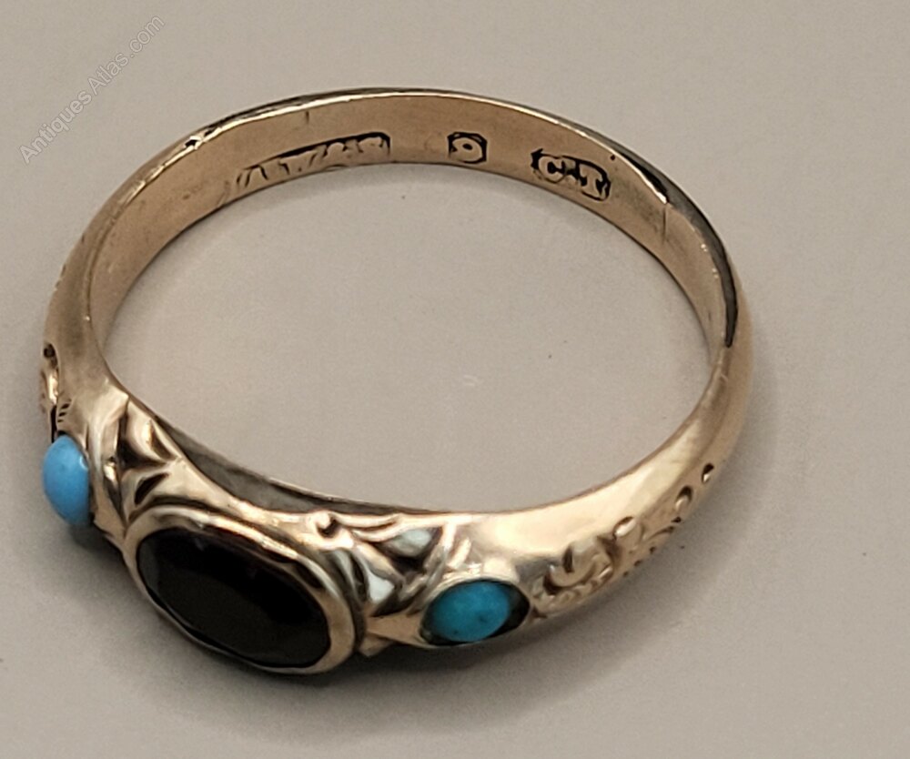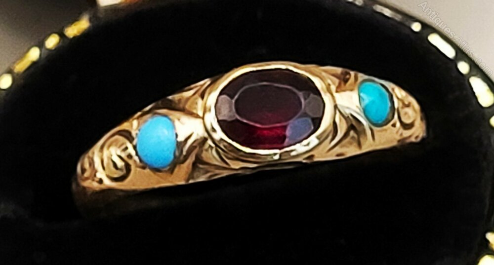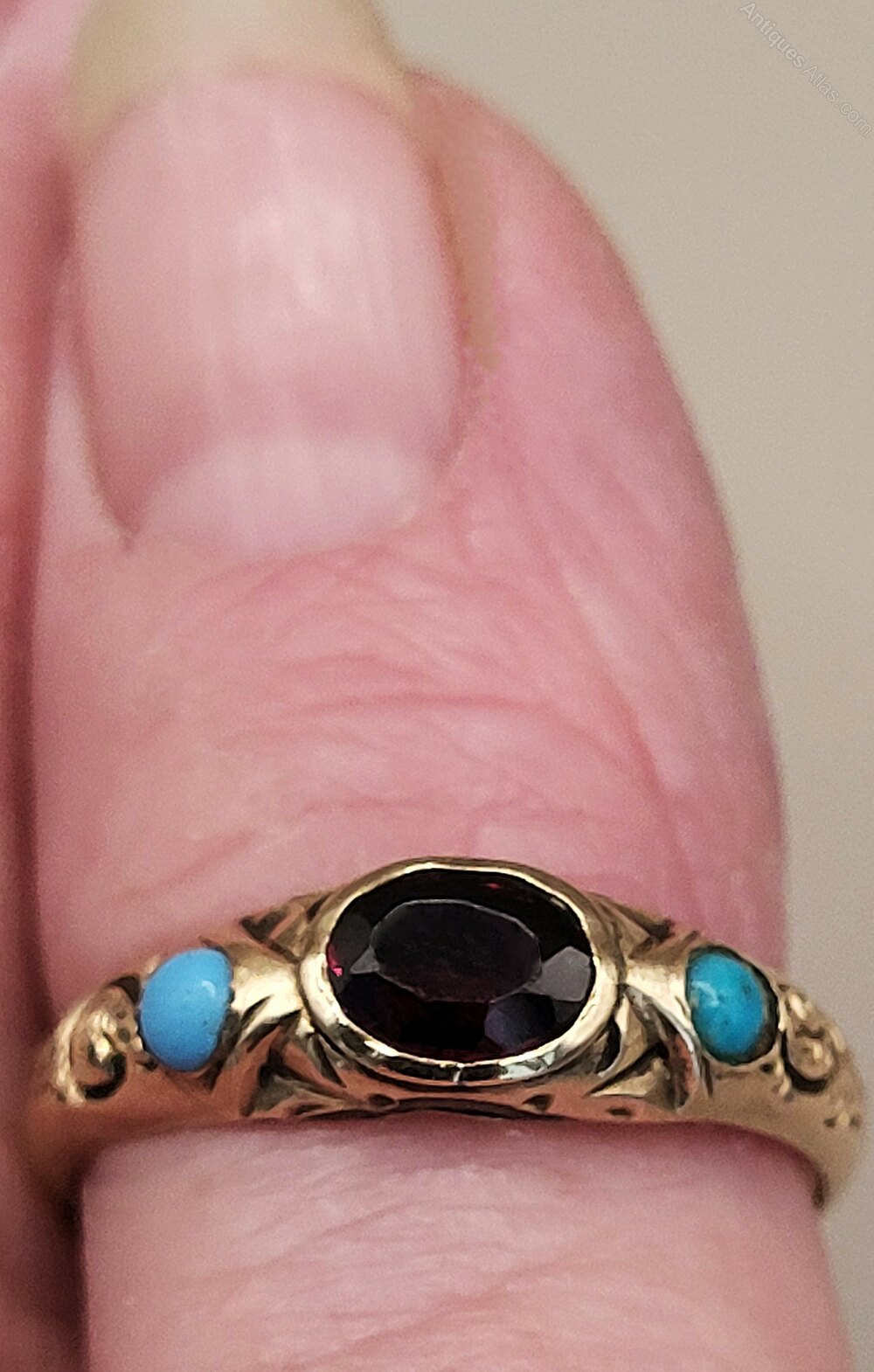 Victorian 9ct Gold Garnet & Turquoise Ring. Size L