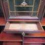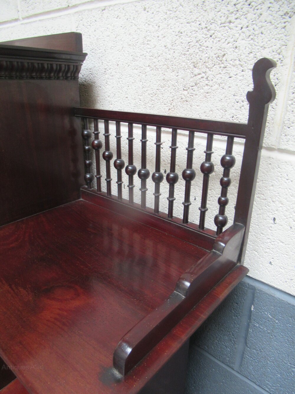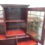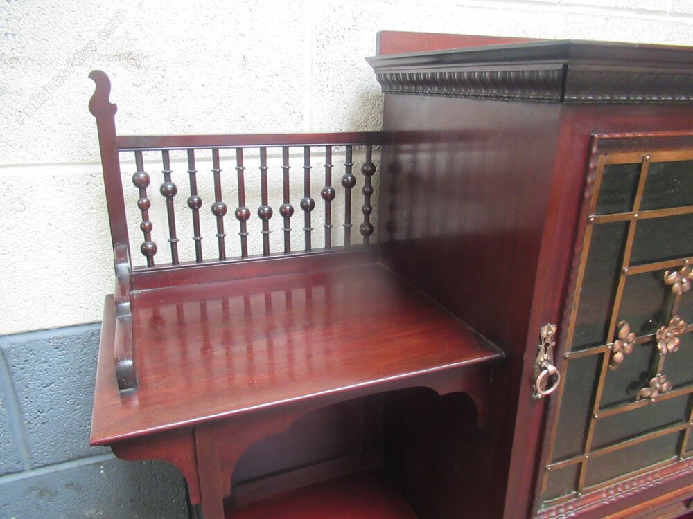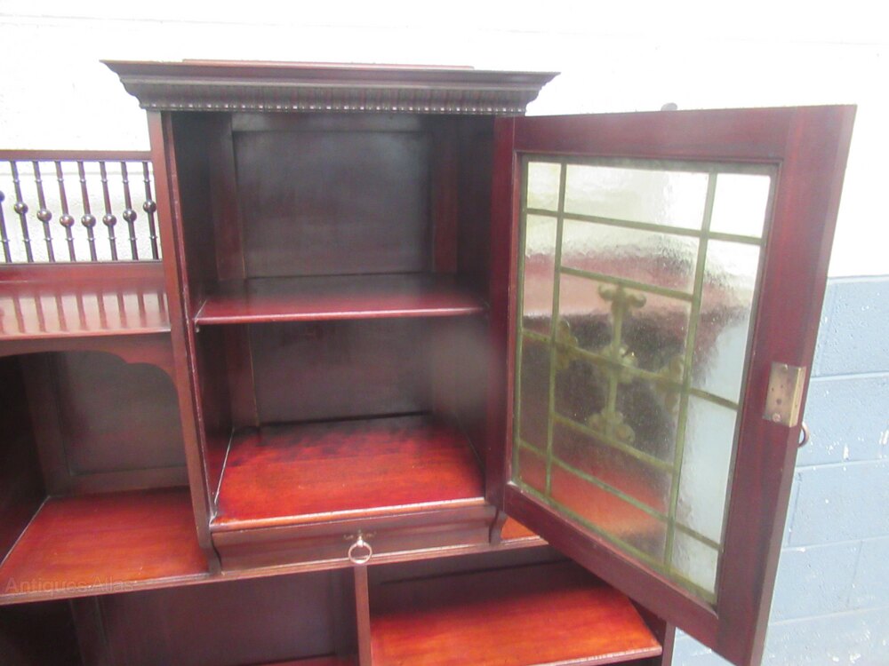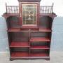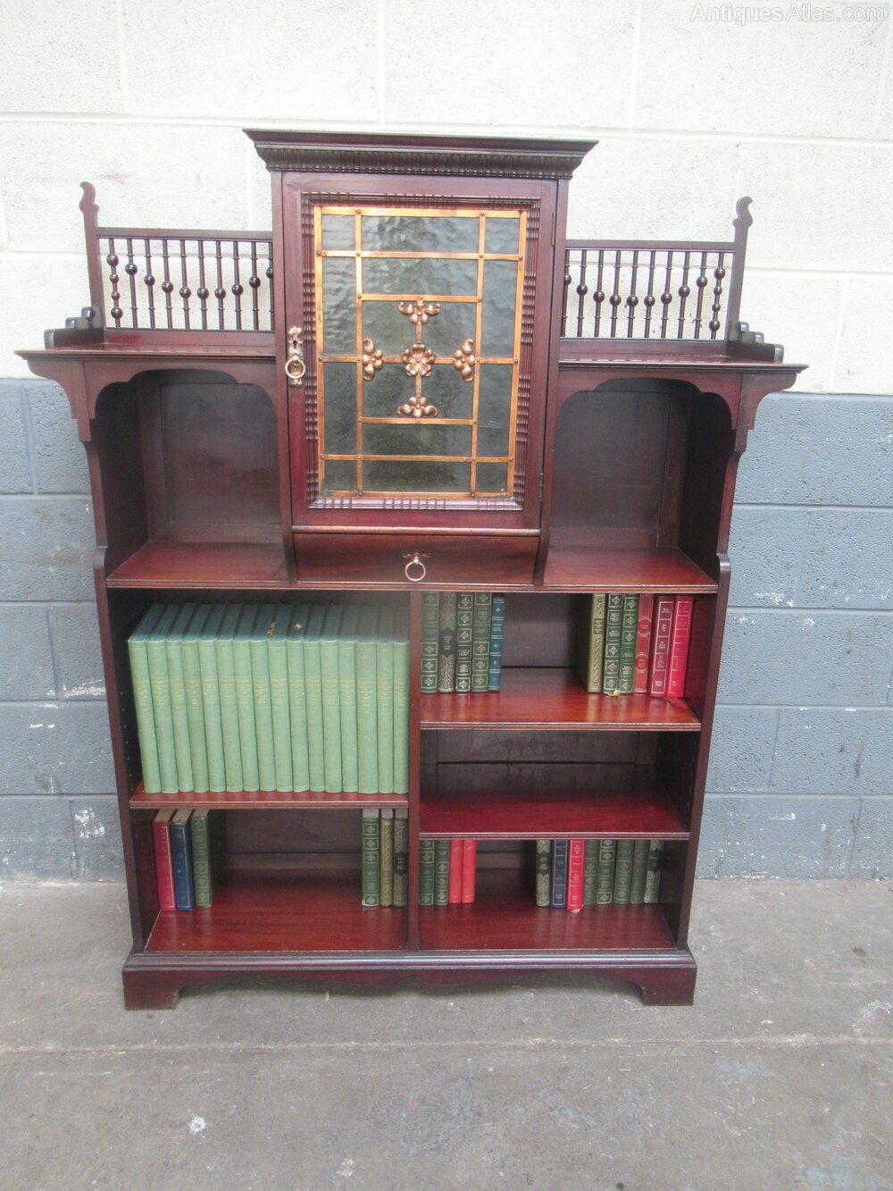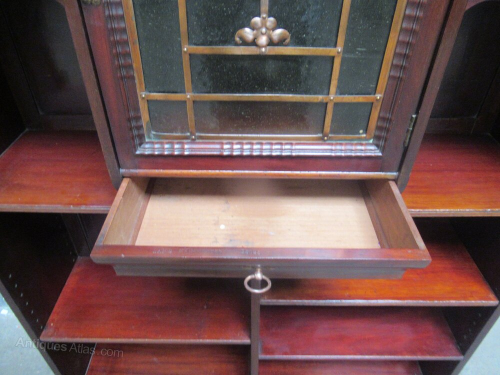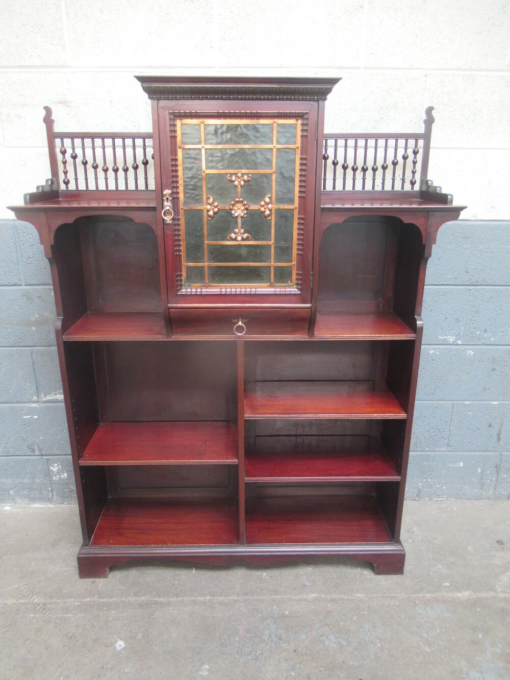 Late Victorian open bookcase in Mahogany by makers Lamb of Manchester, Dating from 1890. The bookcase has three adjustable shelves, with shaped compartments to each side top . The back has a bobbin turned gallery , with a centre glass cabinet with copper decoration, a small drawer below
