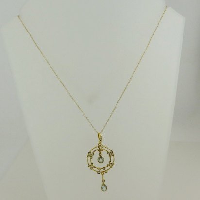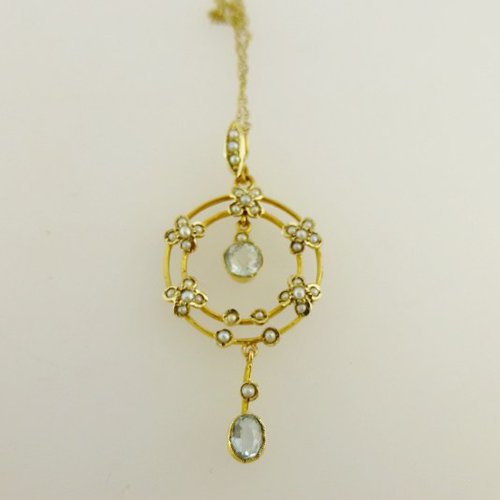 A most beautiful aquamarine pendant. The pendant has two lovely facet cut aqua stones and lovely flower detail set with seed pearls. The design looks like a reef of flowers with a aquamarine drop in the middle followed by a further drop below. The bale of the pendant is decorated with graduated pearls similar to the design below and connects the 9ct chain to the pendant nicely.