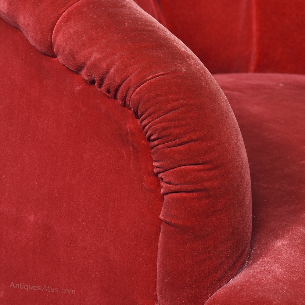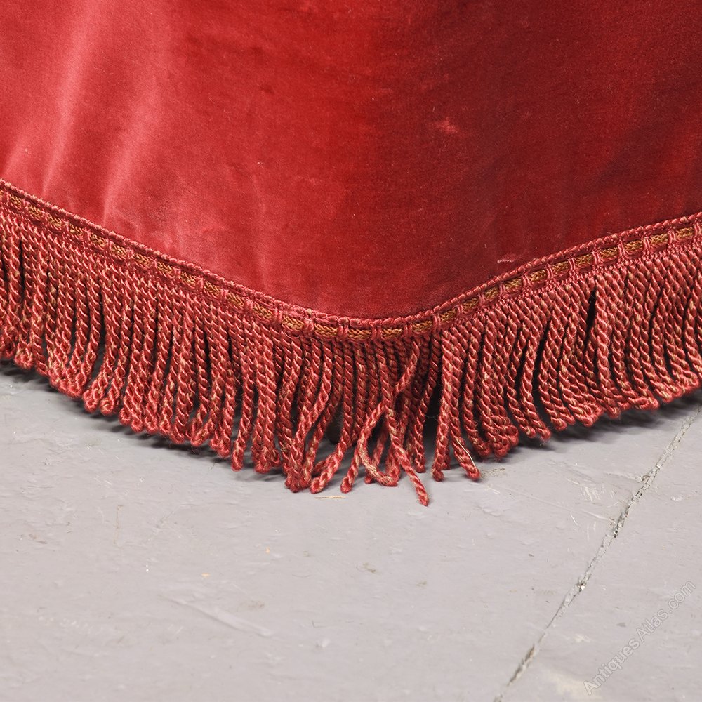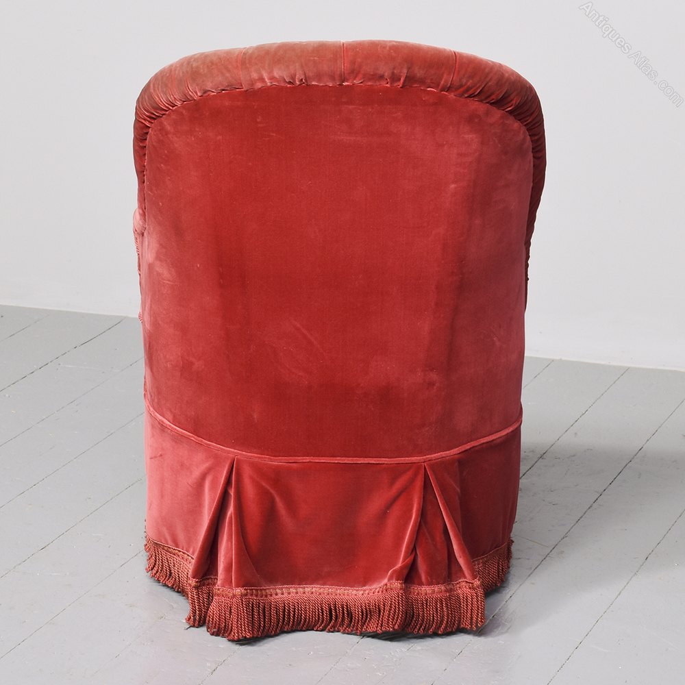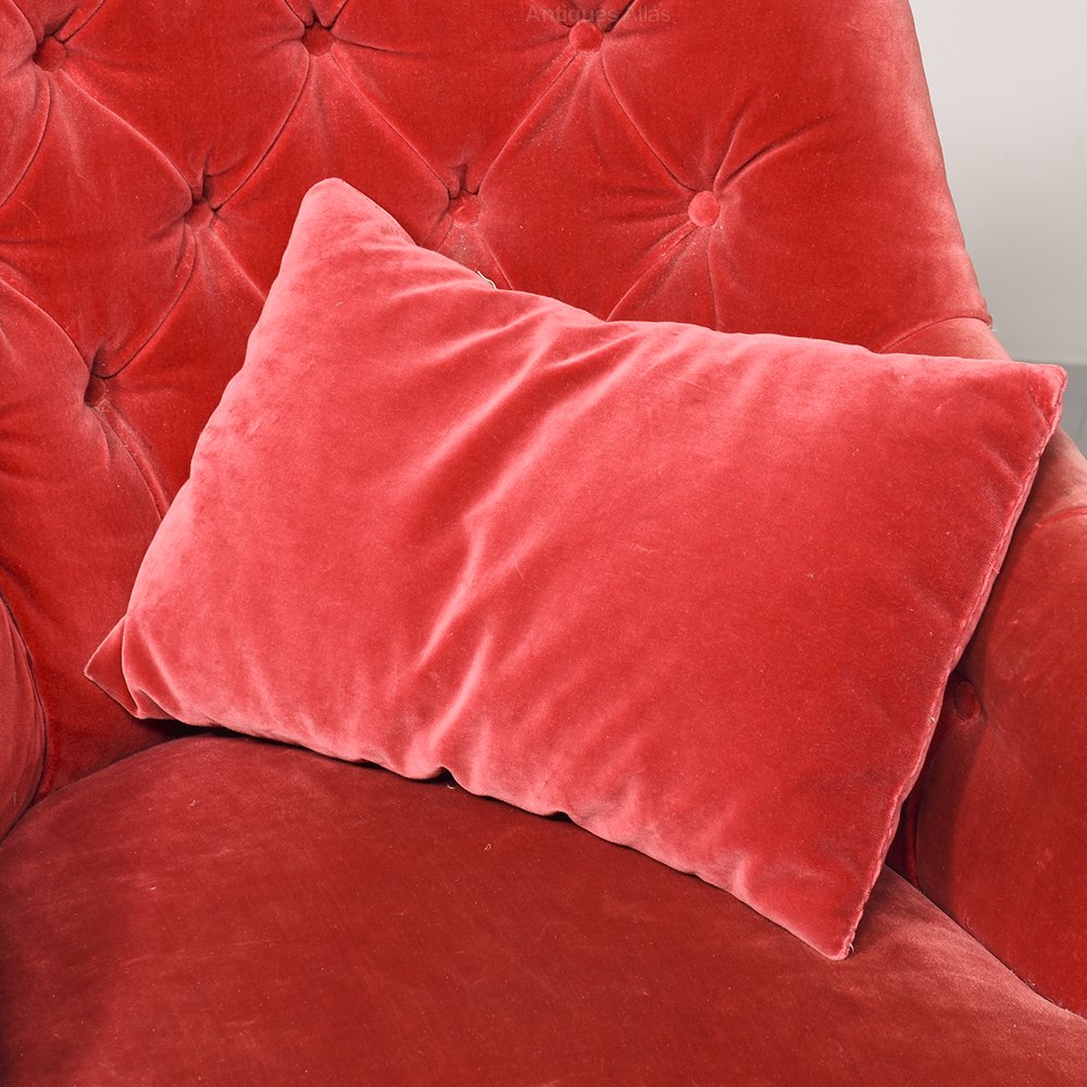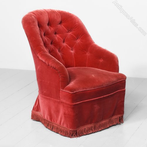 Circa 1880. An elegant shaped Victorian bedroom chair, upholstered in cardinal red velour, pleated and deep buttoned. The stuff over seat with cord to the fore-edge and piping beneath. The chair has a full-length apron that continues around all sides covering the feet. The front legs are turned, ring turned and tapering finishing on brass and porcelain castor. There is an additional small cushion.