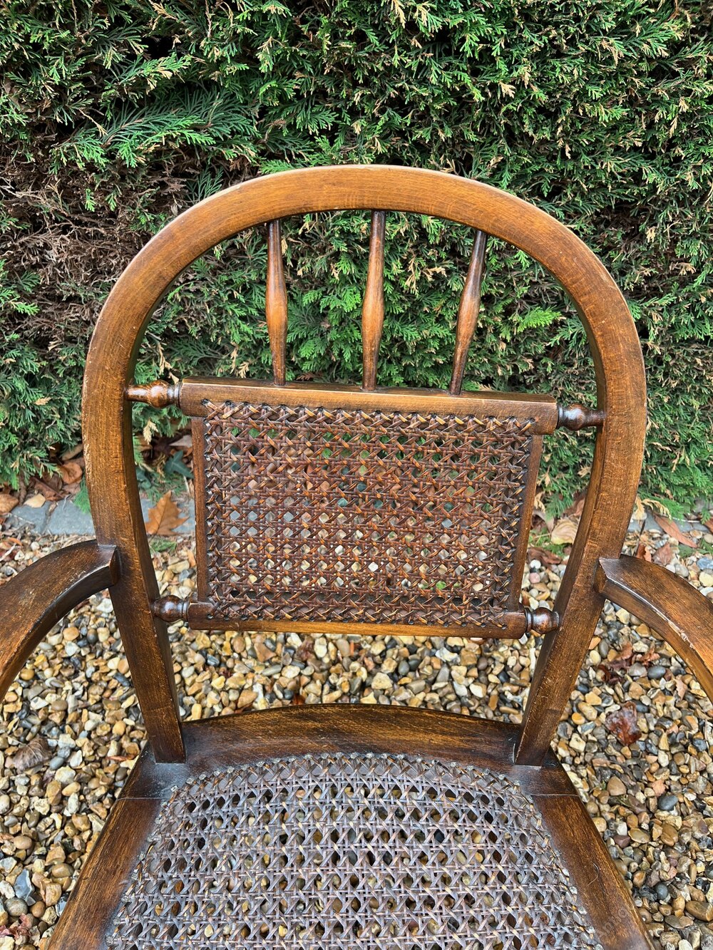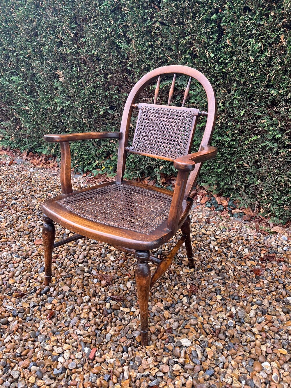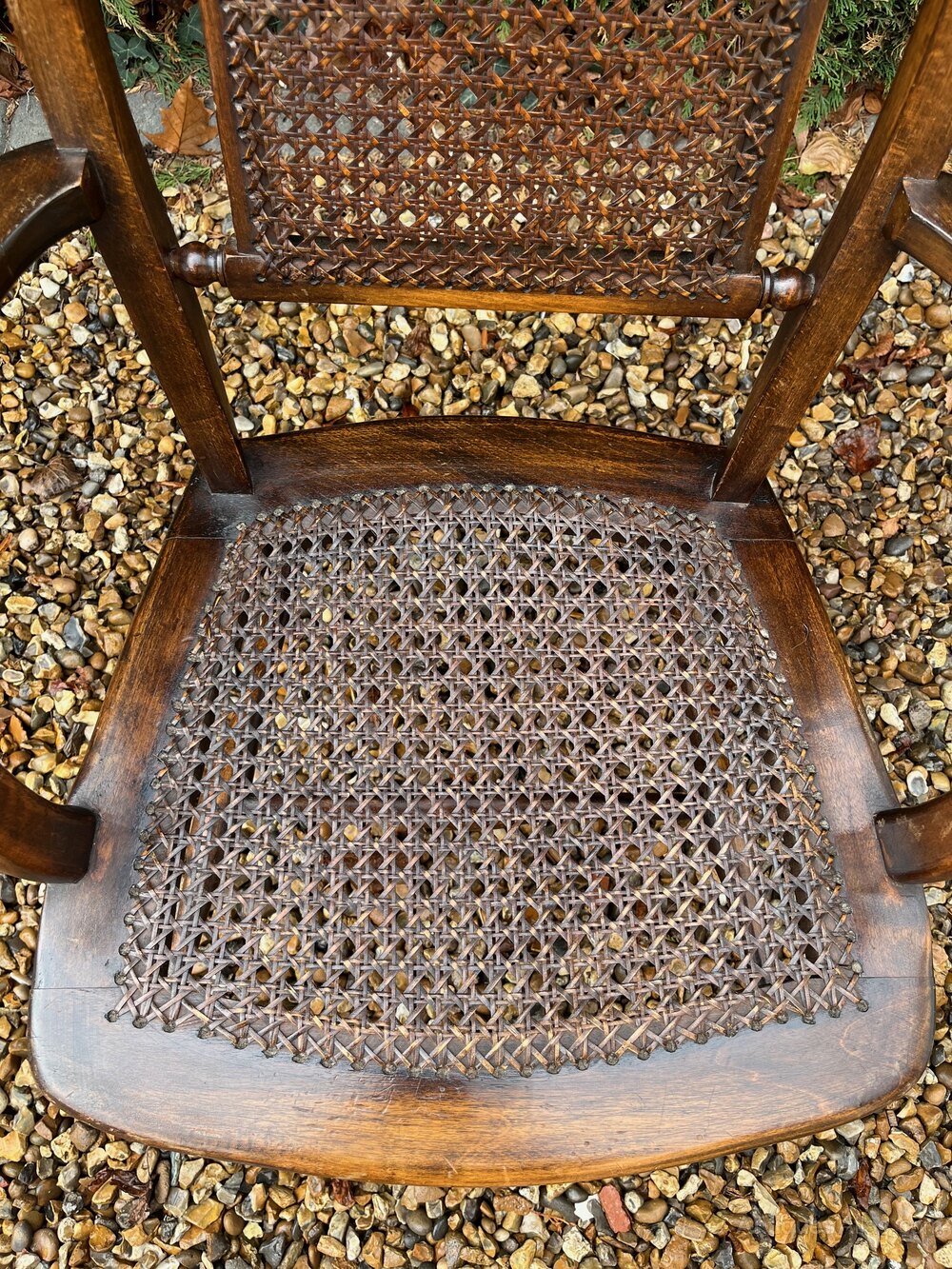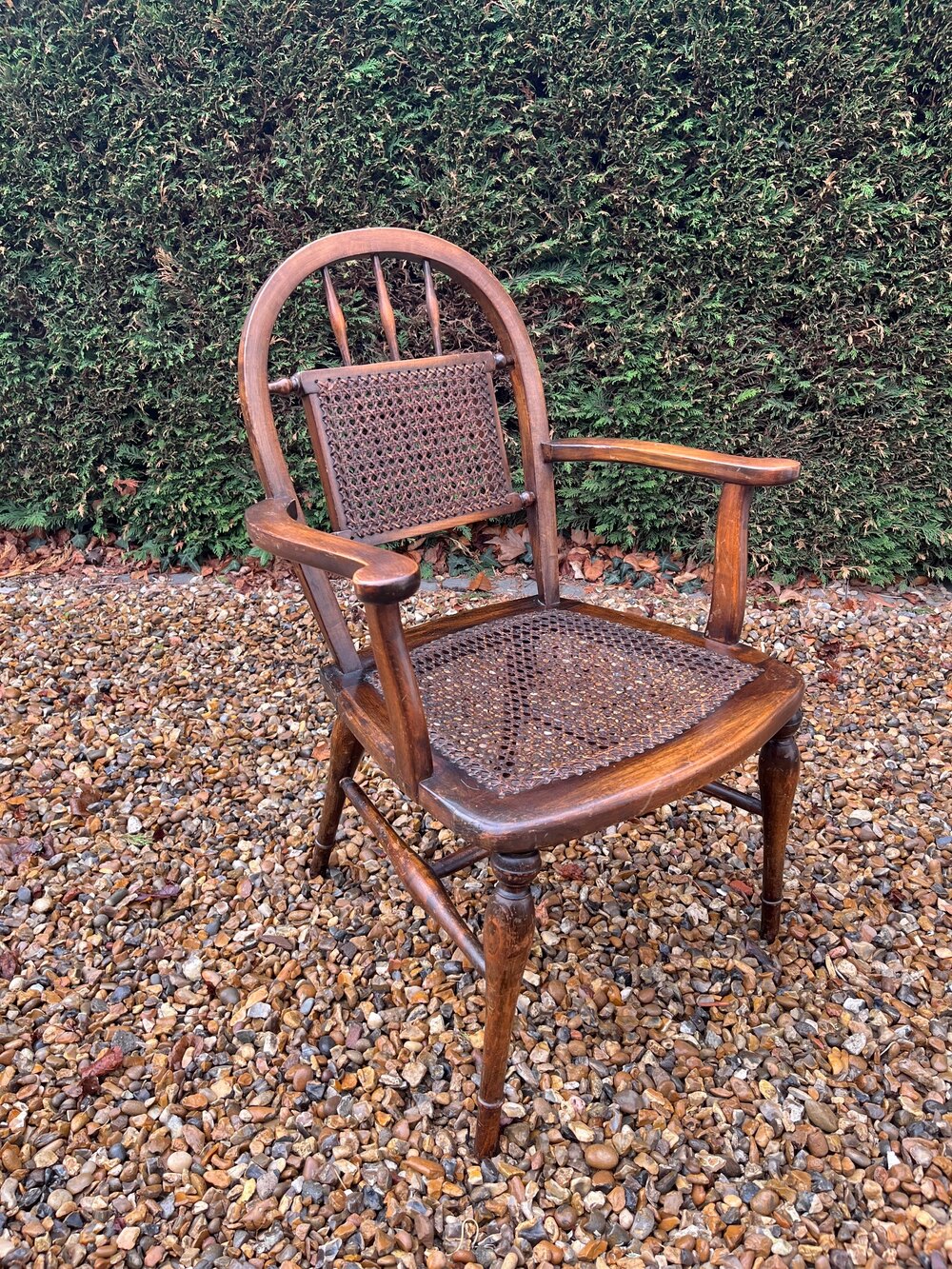 A Victorian beech and cane armchair. It has marks and wear commensurate with its age and previous use.