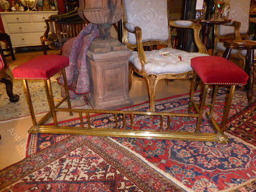 A stylish neat sized, Victorian brass Club Fender with red velvet cushioned seats, dimensions are approx. 48 inches between the feet, 14 inches depth of feet and 18 inches tall.